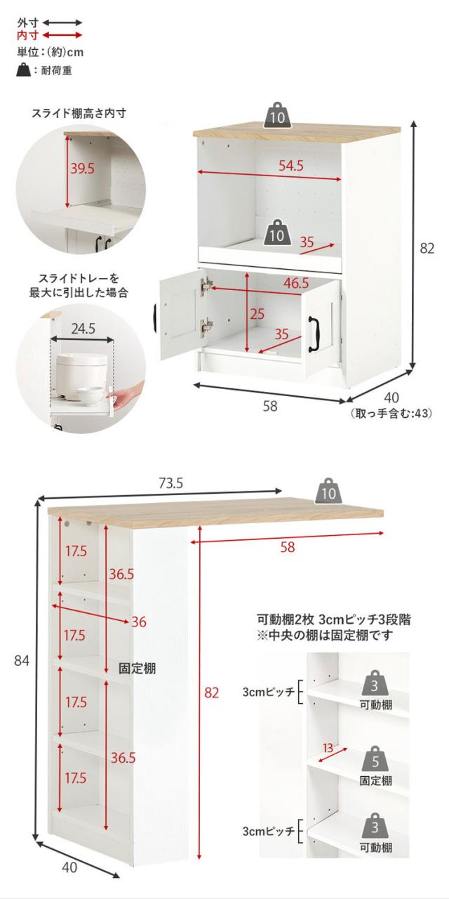 扉収納タイプ キッチンラック 幅58cm | 扉収納タイプ 伸縮カウンターセット | スライド棚タイプ キッチンラック 幅58cm | スライド棚タイプ 伸縮カウンターセット |