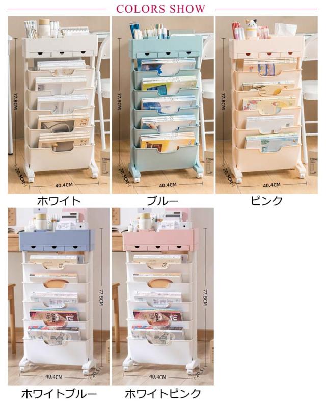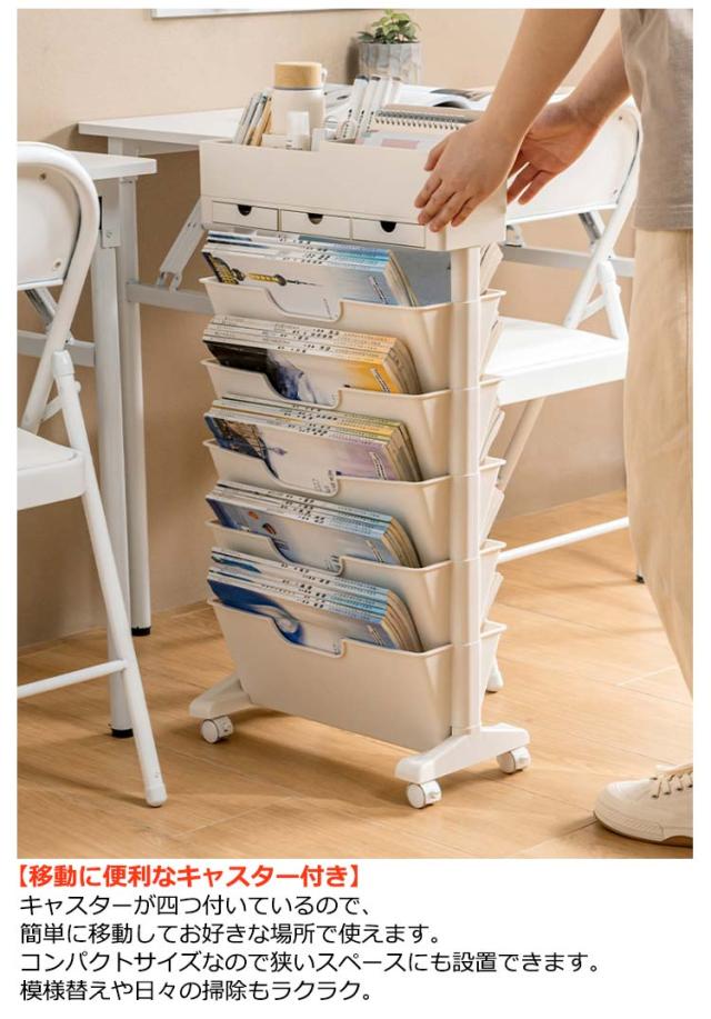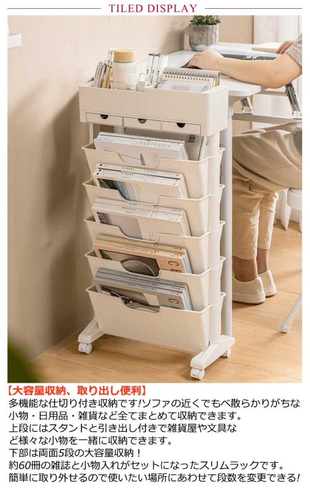 | A4やA3サイズの書類も収納可能な大容量かつスリムなワゴン キャスター付きで移動も楽々♪ 小物入れ引き出し付き 【大容量収納、取り出し便利】 多機能な仕切り付き収納です!ソファの近くでもベ散らかりがちな小物・日用品・雑貨など全てまとめて収納できます。 上段にはスタンドと引き出し付きで雑貨屋や文具など様々な小物を一緒に収納できます。 下部は両面5段の大容量収納!約60冊の雑誌と小物入れがセットになったスリムラックです。 簡単に取り外せるので使いたい場所にあわせて段数を変更できる! 【移動に便利なキャスター付き】 キャスターが四つ付いているので、簡単に移動してお好きな場所で使えます。 コンパクトサイズなので狭いスペースにも設置できます。 模様替えや日々の掃除もラクラク。 【コンパクトで省スペース設計】 わずかの設置スペースで驚くほどの快適空間に! 奥行が21cmというコンパクトな幅サイズによりキッチンだけでなくリビングやダイニングで隙間収納として活躍できます。 教科書や参考書、勉強道具を収納したり、レシピブックや調理道具を入れたり、 キッチン・オフィス・トイレ・ベッドルーム、リビング、子供部屋、キッチンなど、様々なシーンで活躍します。 【おしゃれで長持ち】 厚みのPP*PS素材、耐荷重が大きい、変形しにくい、しっかりしていて安定です。 デザインにも質感にもこだわった存在感のあるインテリア。 独特でオシャレな設定なので,エレガントなインテリア家具として演出できます。 組み立て方: 1.ベースにキャスターを取り付けます。キャスター無しでも使えます。 2.ベースをラック底に取り付けます。 3.ラック上部に支柱を取り付けます。 4.支柱の上に小物入れを取り付けて完成です。 <details> ●バリのない滑らかなエッジ手をつけません。 ●ストッパー付き、360°回転キャスター。 ●仕切り付きで雑誌が滑りません。 | |