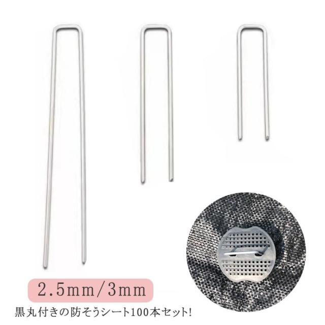 防草しーと Uピン杭 ピン 防草シート 黒丸付 固定ピン 100本 100組セット 人工芝 防草布 固定用 日よけネット固定 100組セット おさえピン 押さえピン 園芸 2.5mm