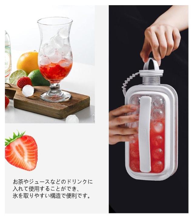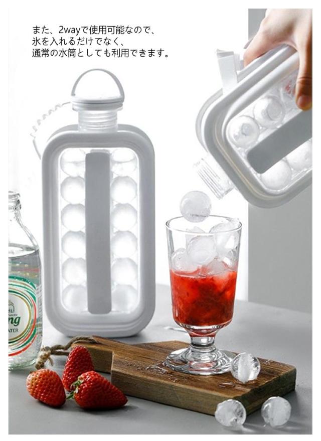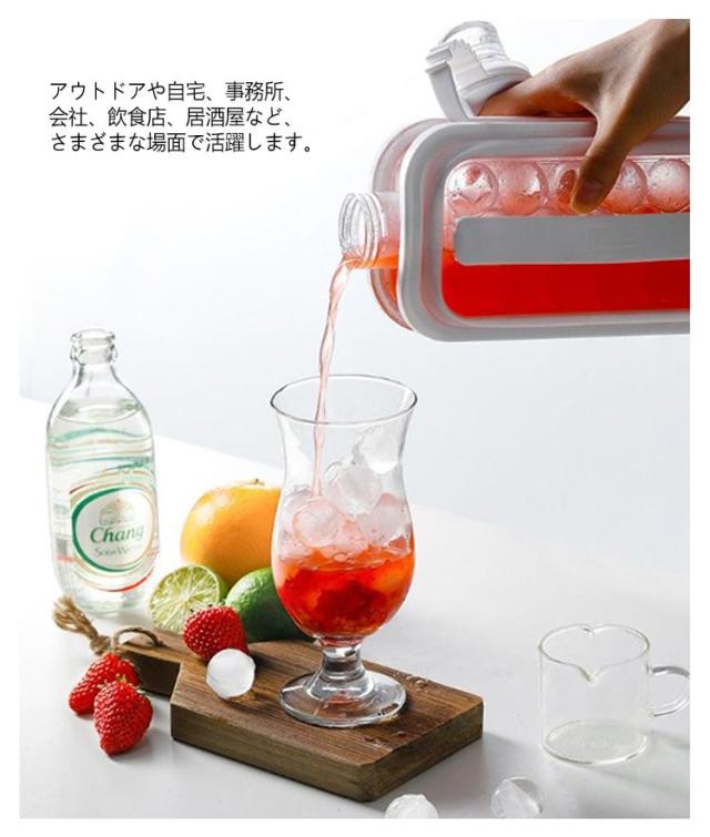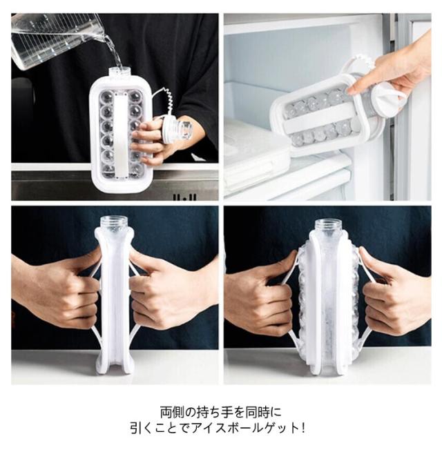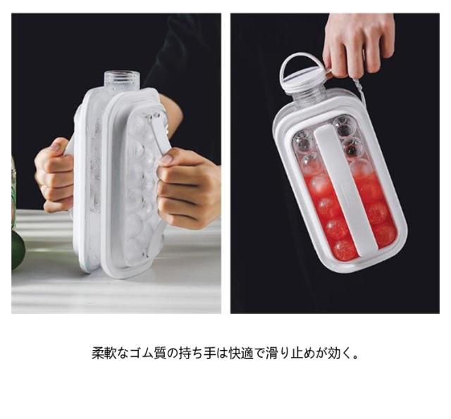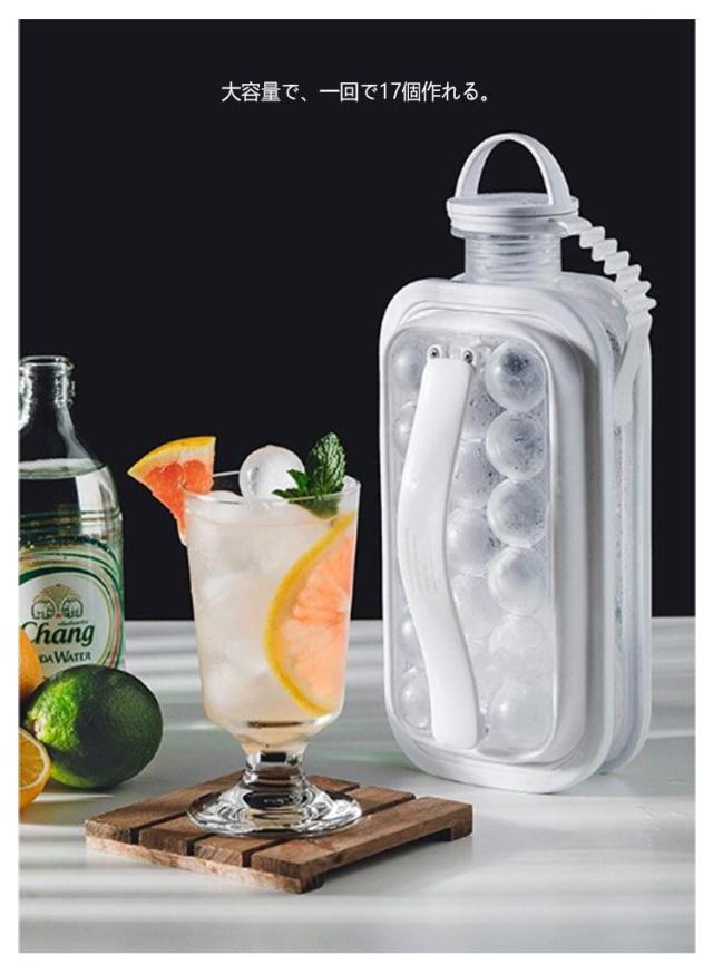 | 氷が手軽に作れる!水筒型製氷ボトル 大容量で、一回で17個作れる。 両側の持ち手を同時に引くことでアイスボールゲット!柔軟なゴム質の持ち手は快適で滑り止めが効く。 アウトドアや自宅、事務所、会社、飲食店、居酒屋など、さまざまな場面で活躍します。 お茶やジュースなどのドリンクに入れて使用することができ、氷を取りやすい構造で便利です。 また、2wayで使用可能なので、氷を入れるだけでなく、通常の水筒としても利用できます。 | |