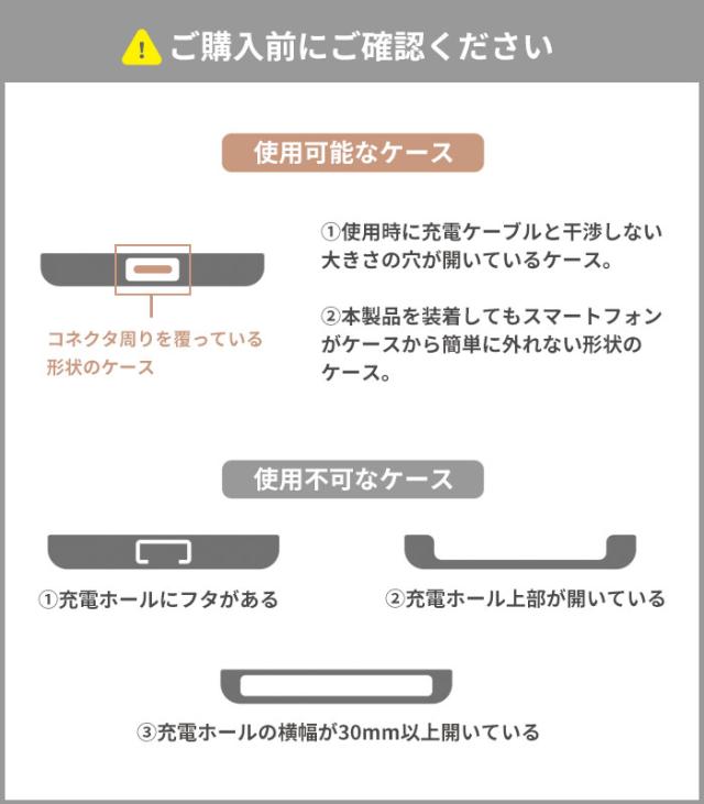 ●フレームだけのバンパー型ケースやスマホ充電口に穴がないケースなどは装着できません。充電口のサイズによってはタグが入らない事がございますので、予め使用されるケースの仕様をご確認ください。