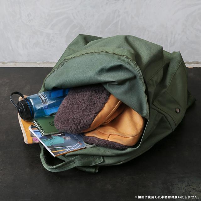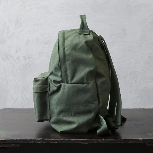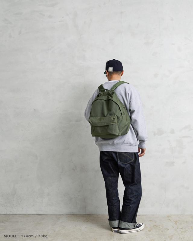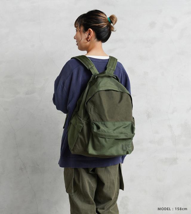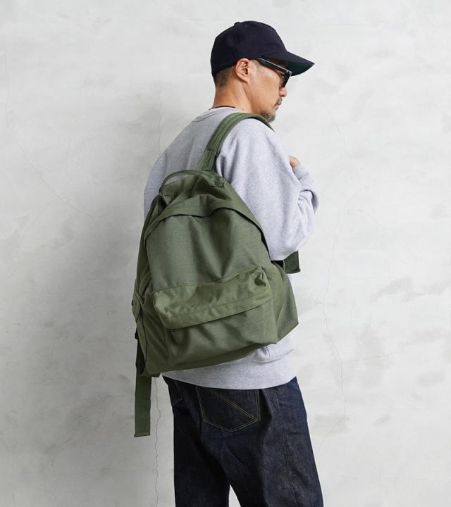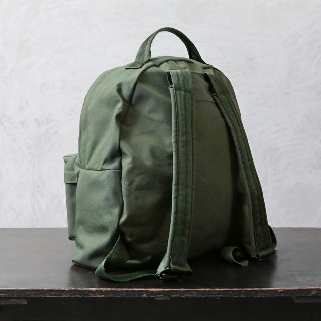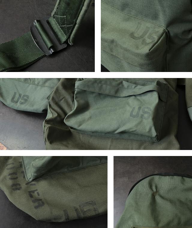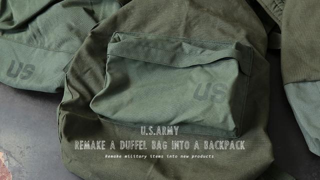 米軍の兵士が移動する際、個人の持ち物を詰め込んで運搬する為の大容量なダッフルバッグを使用して、バックパックをWAIPER.incのリメイクで制作しました。20L相当のバックパックで、1〜2泊程度の着替えも入るため、旅行やデイリーユースにも重宝します。1つあるとさまざまなシーンで活躍してくれる丁度よいサイズ感です。コーデュラナイロンファブリックを使用していることで知られている米軍の「ダブルストラップ コーデュラナイロン ダッフルバック」は、クッション付きのショルダーハーネスや金属製バックルが付属したデザインですので、素材だけでなく様々なパーツも利用してバックパックとして再構築しています。年代も使用状況も様々なバッグは1点物のように様々な表情を見せるリメイクアイテムです!