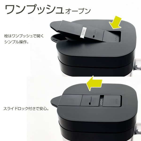 シンプル操作栓はワンプッシュオープンのシンプル操作。スライドロック付きで安心。