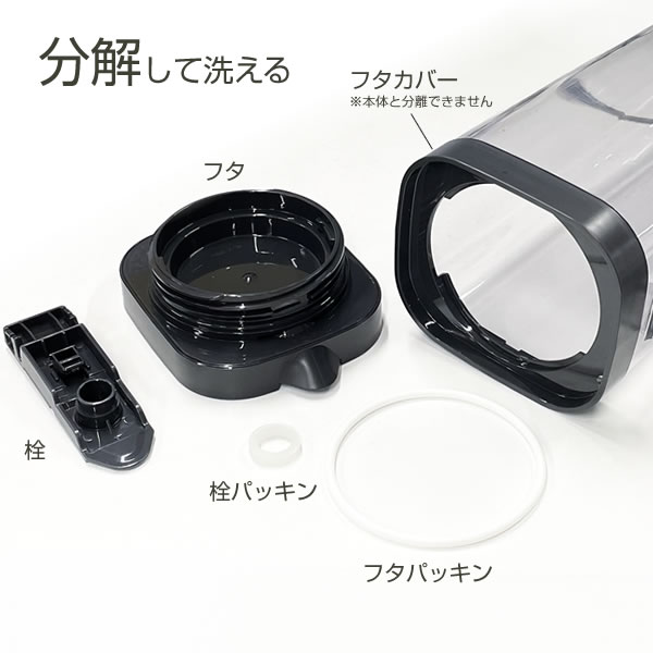 材質:本体・本体カバー/AS樹脂 フタ・フタカバー/ポリプロピレン 栓・止め具/ABS樹脂 フタパッキン・栓パッキン/シリコーンゴム