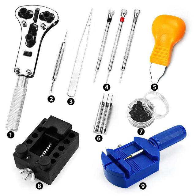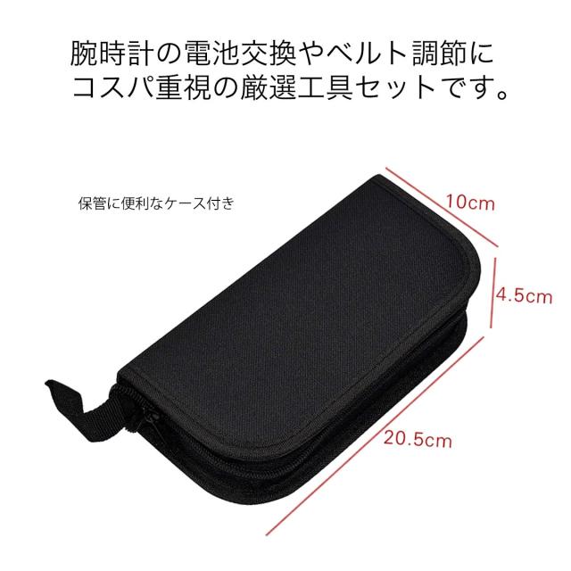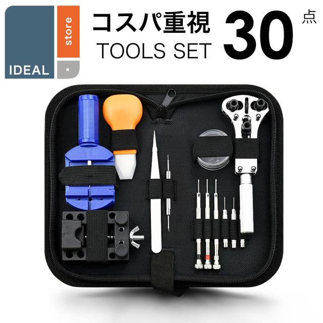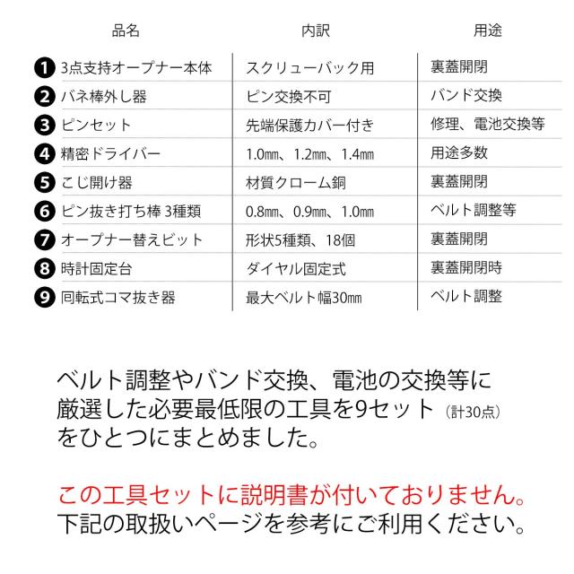 このセットには、電池交換からベルト調整、バンド交換をするのに必要になる最低限の工具9種類(計30点)がセットになっています。 ちょっとした事なら、どなたでもこのセットを使って、時計店や修理店に行くことなく、自宅で簡単に時計のメンテナンスやカスタマイズを行うことができます。このセットには、時計の裏蓋を開けるためのさまざまな種類のケースオープナー、微細な調整を可能にするピンセット、バンドのサイズ調整を行うためのリンクピンリムーバーなど、あらゆる修理作業に必要なツールが含まれています。また、それぞれのツールは使いやすく設計されているのも特徴です。 時計コレクションを自分で管理し、お気に入りの腕時計をいつでも使いやすい状態を保つのに役立つ工具セットです。