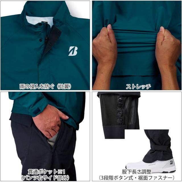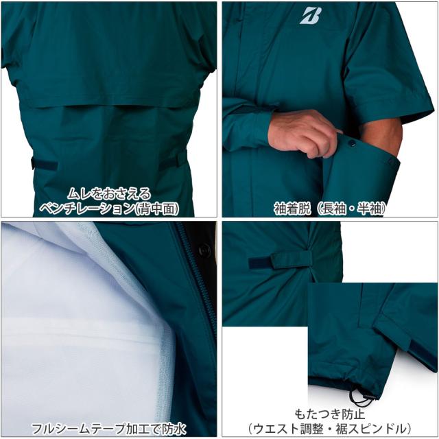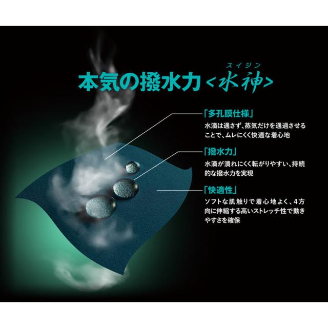 ブリヂストンゴルフのレインウェア『水神」は進化し続ける撥水力が魅力。高い撥水力に加え、蒸れにくさも実現。ブルゾンは袖着脱可能、パンツは股下長さ調整やもたつき防止などプレーを妨げないよう細部にまでこだわった機能がついた多機能レインウェア。