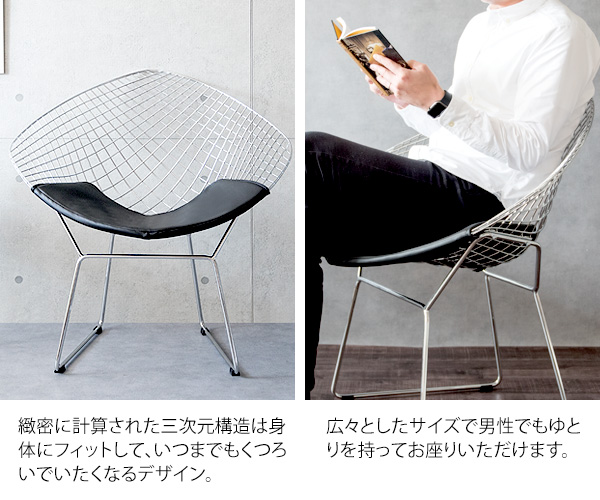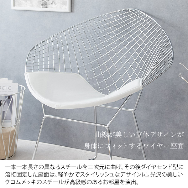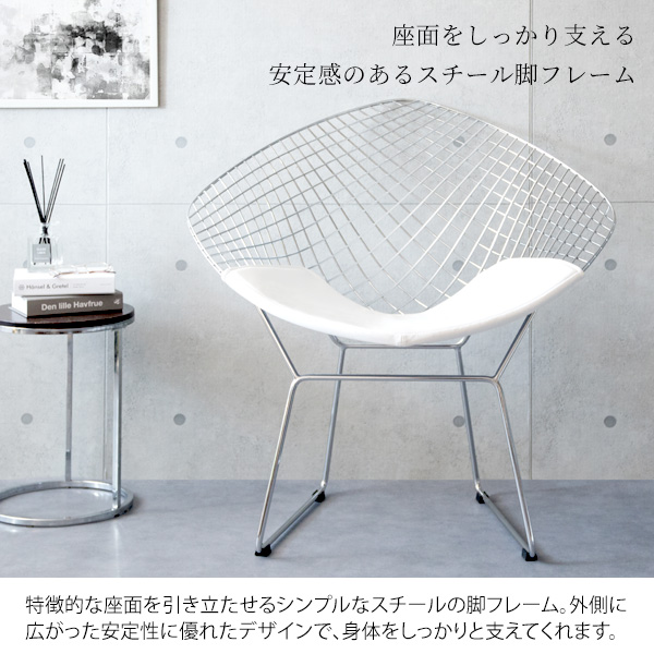 ミッドセンチュリーモダンを代表するデザイナー、ハリー・ベルトイアが20世紀の新しい家具を象徴するデザインとして大ヒットさせ、今もなお愛され続けている『ダイヤモンドチェア』のリプロダクト品です。