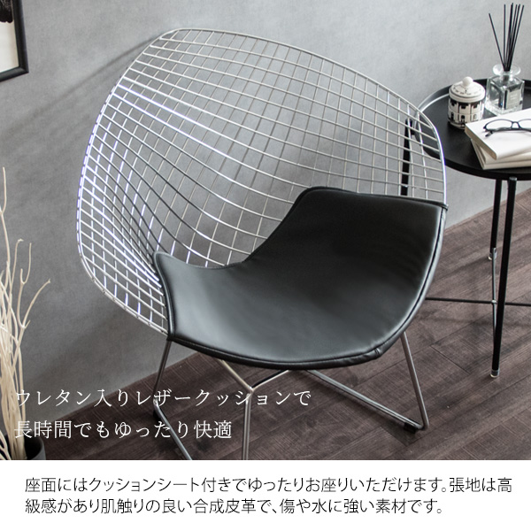 リビングチェア 座面高さ44cm ハリーベルトイア ダイヤモンドチェア リプロダクト カフェ風 椅子 おしゃれ 合皮レザー 軽量 丈夫 ラウンジチェア カフェチェア パーソナルチェア スチール 椅子 曲線 ダイニング 幅83cm 奥行67cm 高さ84cm ブラック ホワイト おうちカフェ インテリア 家具 いす リプロダクト チェア ハリー・ベルトイア カフェ チェア 肘付き アームチェア デザイナーズチェア 背もたれ 椅子 金属の椅子 ダイニングチェア 身体にフィット 固定脚 スチール脚 新生活 リビング 一人暮らし ワンルーム 寝室 店舗 サロン ミッドセンチュリー かっこいい スタイリッシュ シンプル 水に強い 傷に強い くつろぎ ゆったり 快適 合成皮革 シルバー 黒 白 高級感