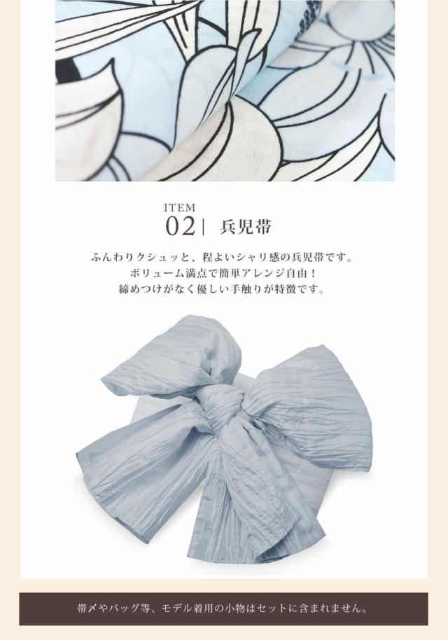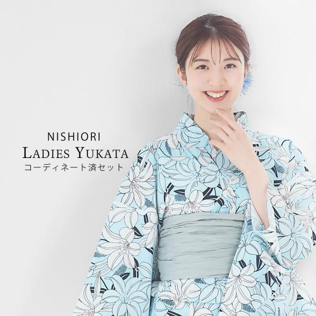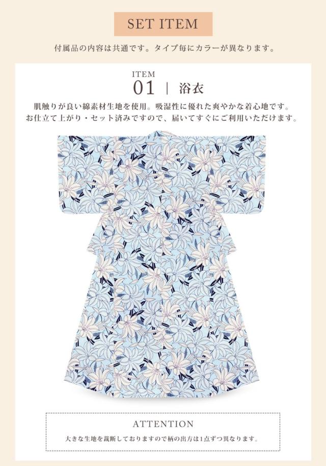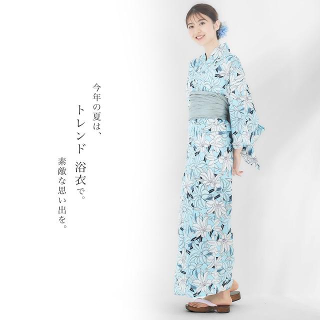 レディース 浴衣 3点セット (ゆかた/帯/下駄) 綿100%【水色地 白百合 帯-グレー】上品 きれいめ 大人の浴衣 セット 20代 30代 40代 華やか フェミニン コットン生地 コーディネート済み 兵児帯 しわふわ