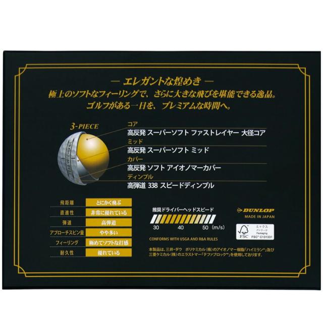 | 素材 | ?高反発スーパーソフトファストレイヤー大径コア, 高反発ソフトアイオノマーカバー, 高弾道338スピードディンプル |