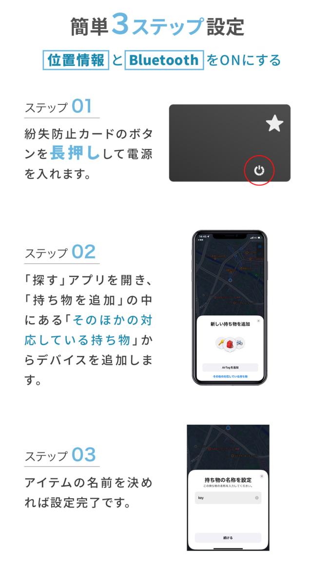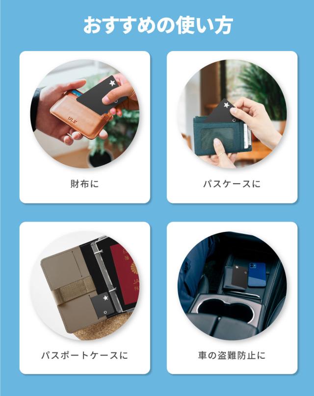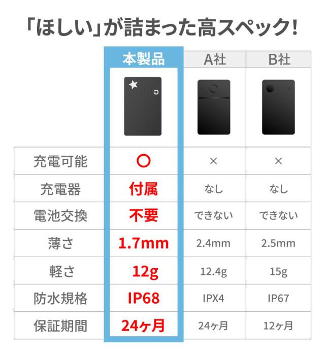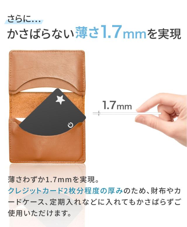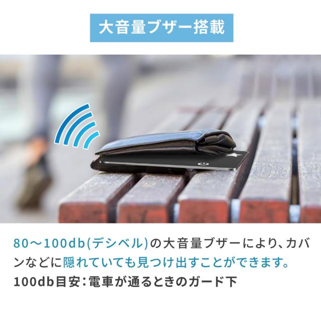| 商品特徴 | ■充電器付き!簡単ワイヤレス充電 専用充電器付きだから、電池交換やワイヤレス 充電器を準備する手間が不要になりました!1回の充電で8ヶ月ご使用いただけます。 ※使い方により、使用できる時間や充電時間が変動します ※ACアダプターは別売りです ■薄さわずか1.7mmを実現 クレジットカード2枚分程度の厚みのため、財布やカードケース、定期入れなどに入れてもかさばらずご使用いただけます。 ■Appleの「探す」アプリに対応 iPhone、iPad、Macデバイスの「探す」ネットワークで、世界中どこでも、落とし物の位置を特定できます(Apple端末のみ)。 スマホから位置をチェックし、20m以内に近づくとライトやアラートで場所を通知します。 持ち物を置き忘れた場合も、持ち物から一定距離離れるとお手持ちのデバイスにバナーで通知が来ます。 最大探知距離を超えた場合、最後に探知した場所に通知します。 【対応機種】IOS14.5 / iPadOS14.5 / macOS12.5以上 例)iPhone13 / iPhone13 mini / iPhone13 Pro / iPhone13 Pro Max / iPhone14/14Plus / iPhone14Pro / ProMax ■業界初!IP68防水機能搭載 水深2mまで、最長30分間、水に耐えられる防水性能を搭載しています。 ■複数のスマートタグを接続可能 複数のスマートタグを何台でもデバイスに追加できるため、家族分の鍵や防犯としてお子さまの持ち物につけるなどの使い方ができます。 ※1つのスマートタグを複数のスマートフォンに同時接続はできません。 ■大音量ブザー搭載 100dB(デシベル)の大音量ブザーにより、カバンなどに隠れていても見つけ出すことができます。 100dB目安:電車が通るときのガード下 ■技術基準適合証明(技適)取得済み 技術基準適合証明番号:210-212276 本製品は日本での技術基準適合証明(技適)を取得しています。 技適証明を取得していない商品を日本国内で使用する場合、電波法違反になる恐れがございます。技適証明取得をしている製品のご購入、ご使用を推奨いたします。 ※製品やパッケージへの技適マーク記載は任意のため、本製品には記載がございません。技適証明取得をご確認されたい場合は、総務省 電波利用ホームページよりご確認ください。 |