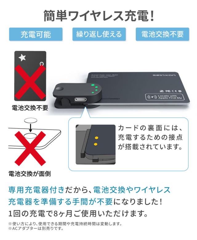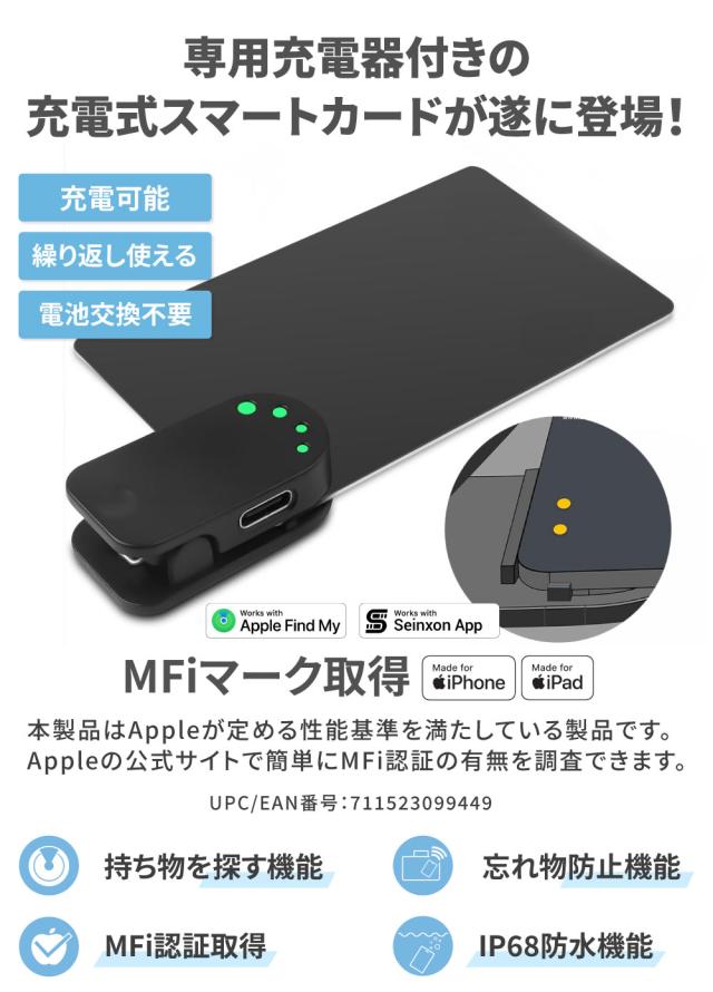 | 商品説明 | 充電器付きの紛失防止カードがついに登場しました! これまでのスマートカードのような煩わしい電池交換は不要。充電するだけで使い続けていただくことが可能です。 さらに、充電器付きだから今日から使い始められます! Apple MFi認証を取得したスマートトラッカーで、「高性能×低価格」を実現しています。 Apple Find Myに対応しているため、Apple製品にてご利用いただけます。 わずか1.7mmという薄さを実現したカードタイプのスマートタグで、何台でもデバイス接続が可能など機能面も充実しています。 財布やパスケースに入れて、なくしものを無くします。 |