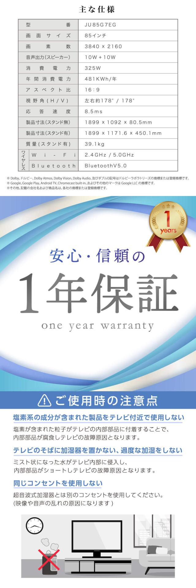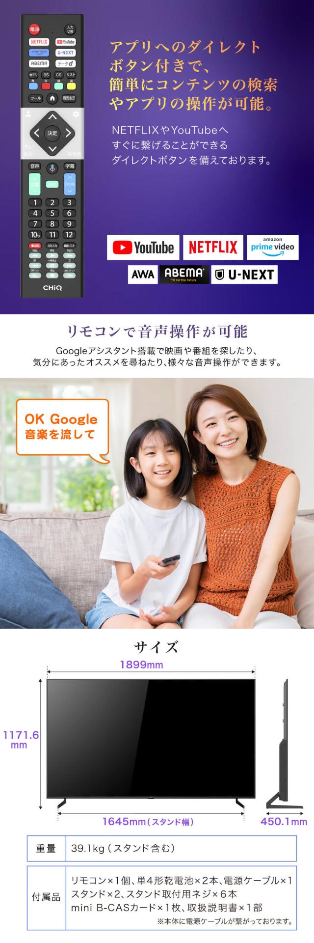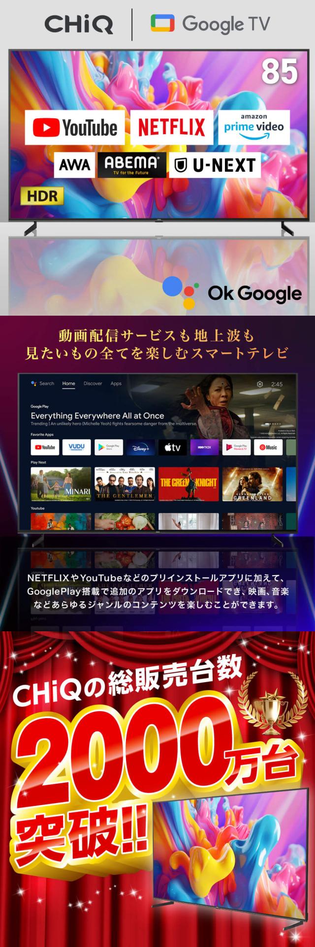 CHiQ テレビ 85インチ スマートテレビ 配信動画 地上波 85型 液晶LED 無線LAN内蔵 Dolby Audio Bluetooth Googleアシスタント対応 壁掛け対応 スマホ連動 NETFLIX YouTube Google TV JU85G7EG CHiQ