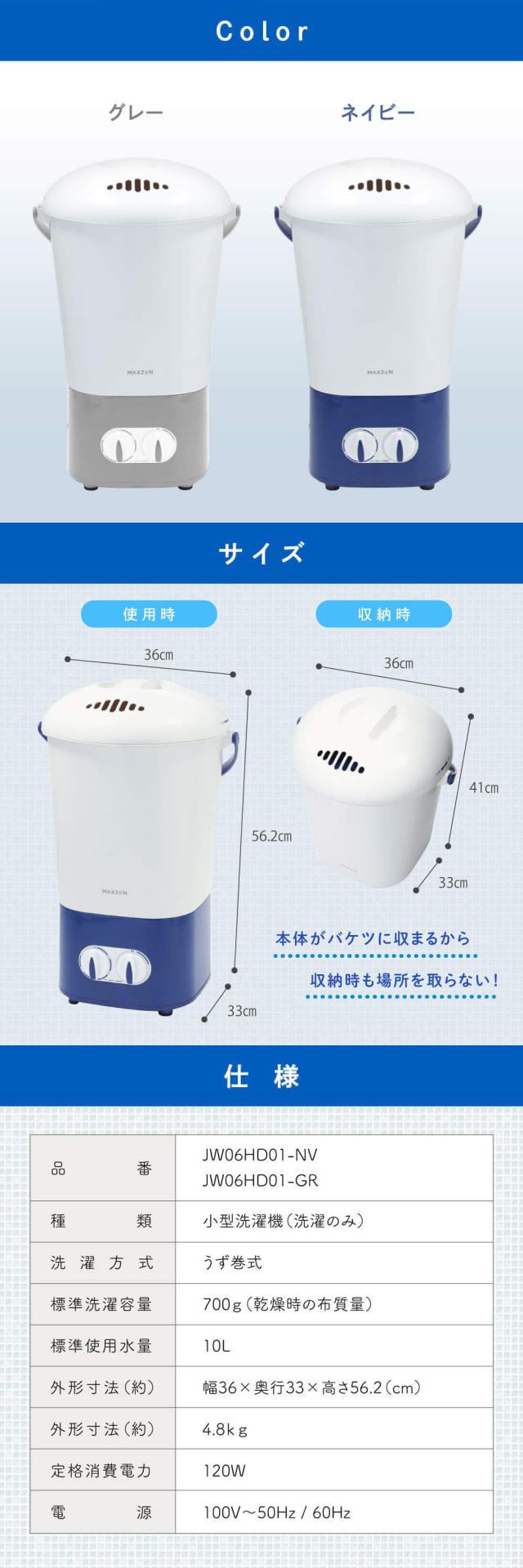小型洗濯機 バケツ洗濯機 バケツウォッシャー ミニ 洗濯容量700g タイマー 工事不要 ポータブル 予洗い 分別洗い 分け洗い 洗濯 マスク洗い ペット 靴下 ユニフォーム バケツ コンパクト グレー JW06HD01-GR マクスゼン