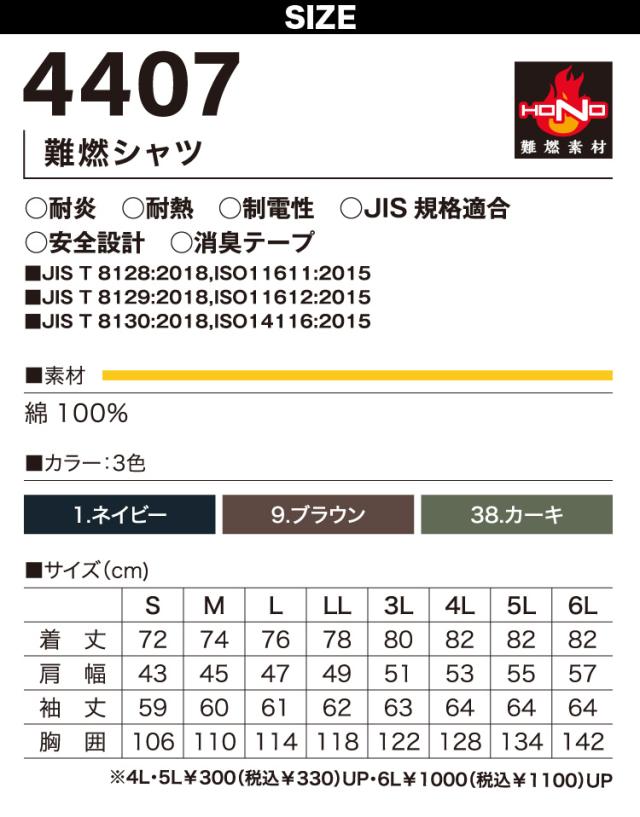 村上被服 難燃シャツ 4407 長袖 単品 綿100% 難燃素材 耐炎 耐熱 制電性 安全設計 消臭テープ 溶接 メンズ 防炎 防護服 作業着 作業服 HONO HOOH 鳳皇