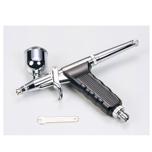 幅1mm以下の細吹きがこなせ、しかもダブルアクションタイプですから、吹きはじめの塗料の飛びがほとんどなく、繊細な吹き幅調整が可能。