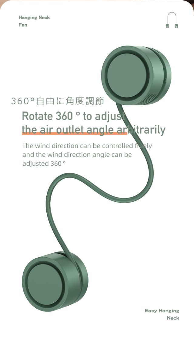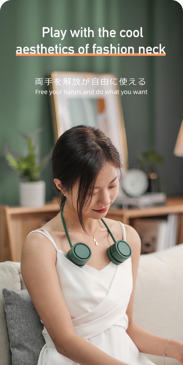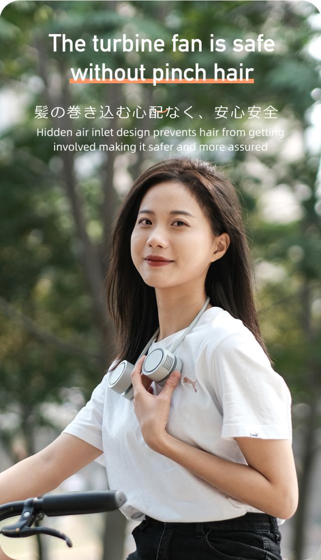 【折り畳み首掛け扇風機】ネックバンドファンはくるっと巻いてコンパクトに収納可能です。羽根なしタイプで、髪や手を巻き込む心配がありません、安全安心に使用できます。 荷物が多い時や雨の日など、両手を解放が自由に使えます。