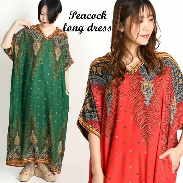 ワンピース エスニック レディース 春 夏 半袖 Vネック ロング マキシ丈 ワンピ 孔雀 ピーコック 柄 総柄 rd61027