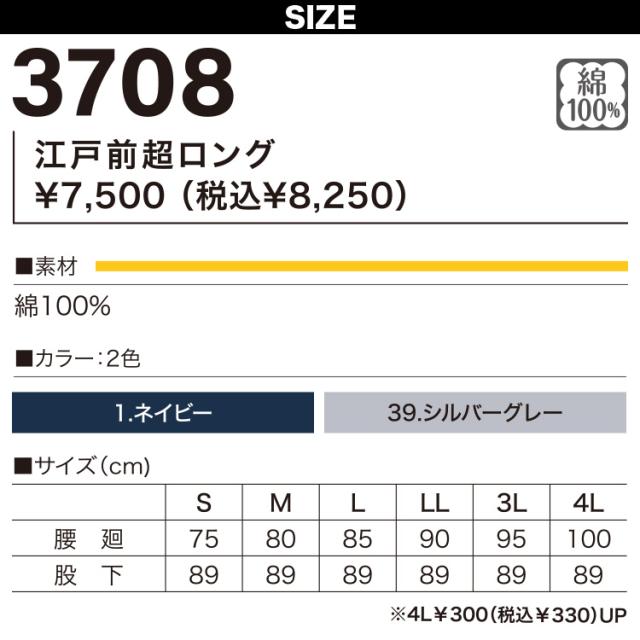 村上被服 江戸前超ロング 3708 単品 綿100% 動きやすい こだわり裏地 裾口三つ釦 鳶服 おしゃれ かっこいい メンズ ニッカ 春夏 作業着 作業服 HOOH 鳳皇