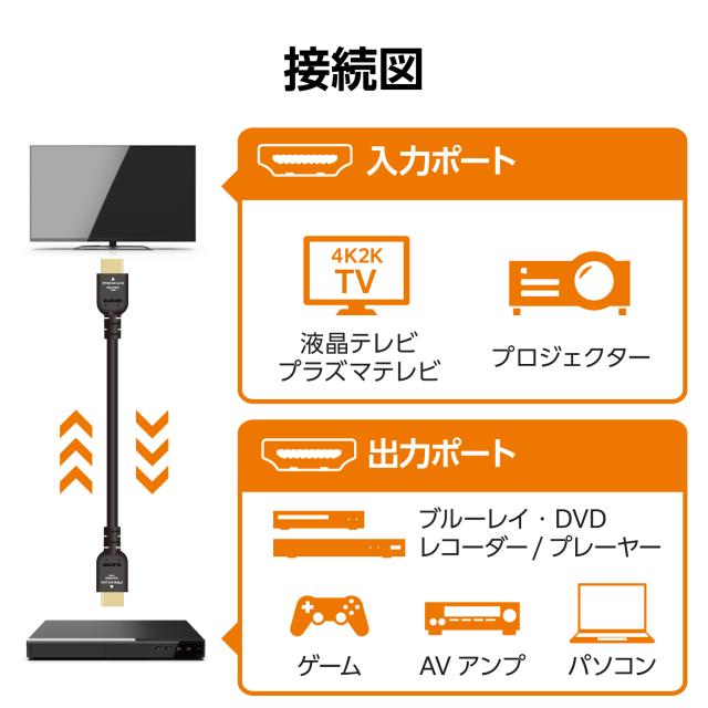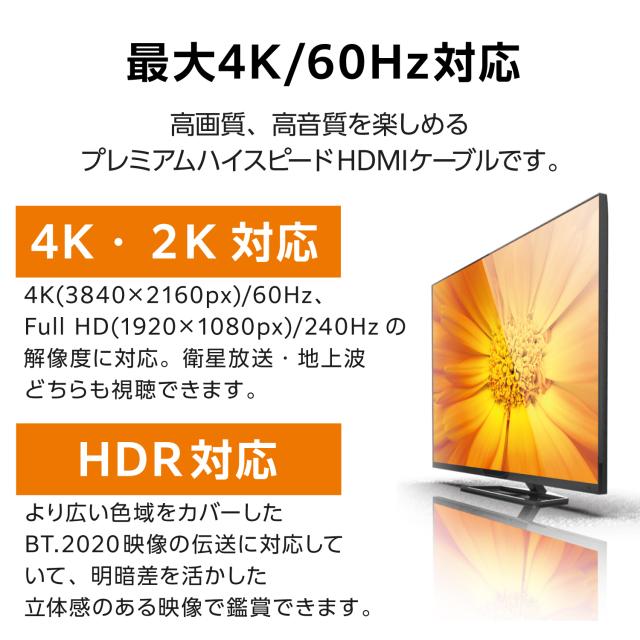 ■最大4K/60Hzの解像度に対応した、イーサネット対応プレミアムハイスピードHDMI(R)ケーブルです。 ■1本のケーブルで、映像信号と音声信号をデジタルのままで高速伝送するだけでなく、イーサネット信号の双方向通信を実現します。 ■100Mbpsのイーサネット通信を実現する、HEC(HDMIイーサネットチャンネル)に対応しています。 ■デジタル音声をテレビなどの表示機器からAVアンプなどの出力機器へ伝送できる、ARC(オーディオリターンチャンネル)に対応しています。 ■最大4K(3840×2160px)/60Hz、Full HD(1920×1080px)/240Hzの解像度に対応しています。 ■明暗差を活かした立体感のある映像を伝送することができるHDRに対応しています。 ■従来のBT.709に比べ、より広い色域をカバーしたBT.2020映像の伝送が可能です。 ■サビなどに強く信号劣化を抑える金メッキピン・金メッキプラグを採用しています。 ■外部ノイズの干渉から信号を保護する3重シールドケーブルを採用しています。 ■コネクター部にはノイズを軽減させる効果のある銅箔製テープシールドを採用しています。 ■自社環境認定基準を1つ以上満たし、『THINK ECOLOGY』マークを表示した製品です。 ■環境保全に取り組み、製品の包装容器におけるプラスチック重量を、社内基準製品より20%以上削減した製品です。 ■環境保全に取り組み、製品の包装容器が紙・ダンボール・ポリ袋のみで構成されている製品です。