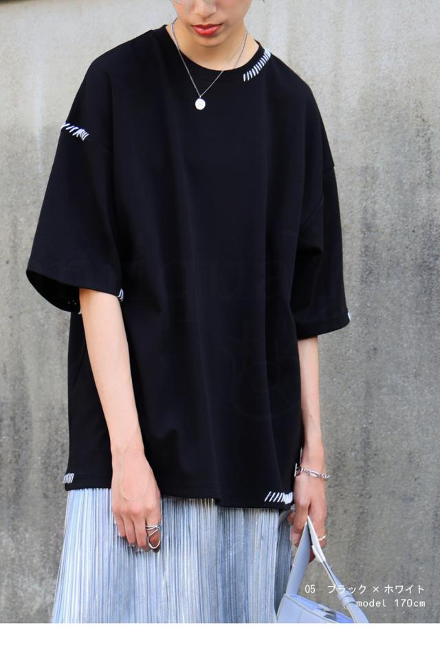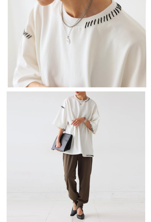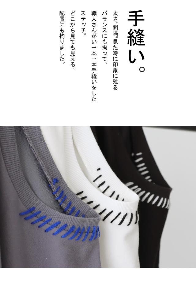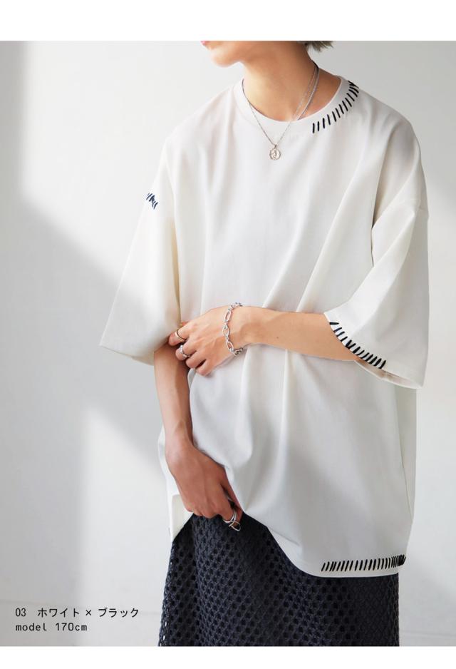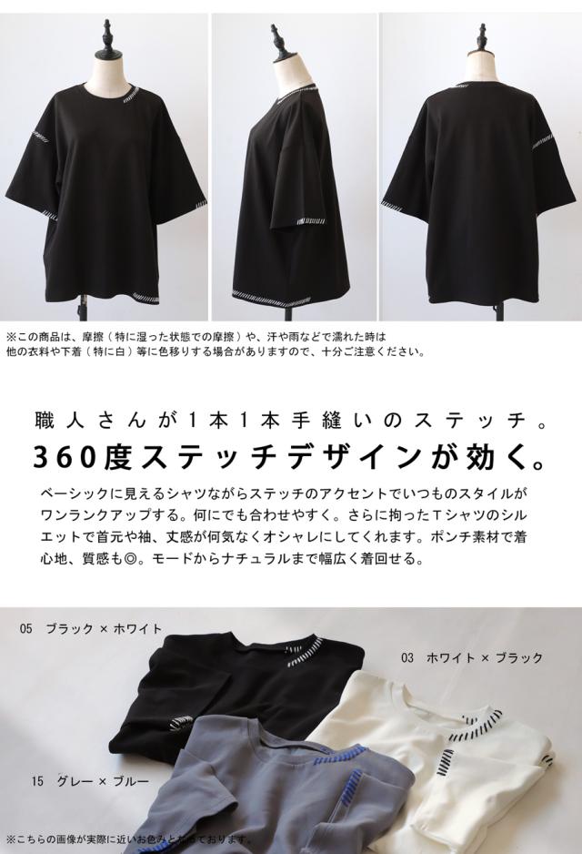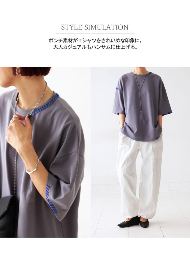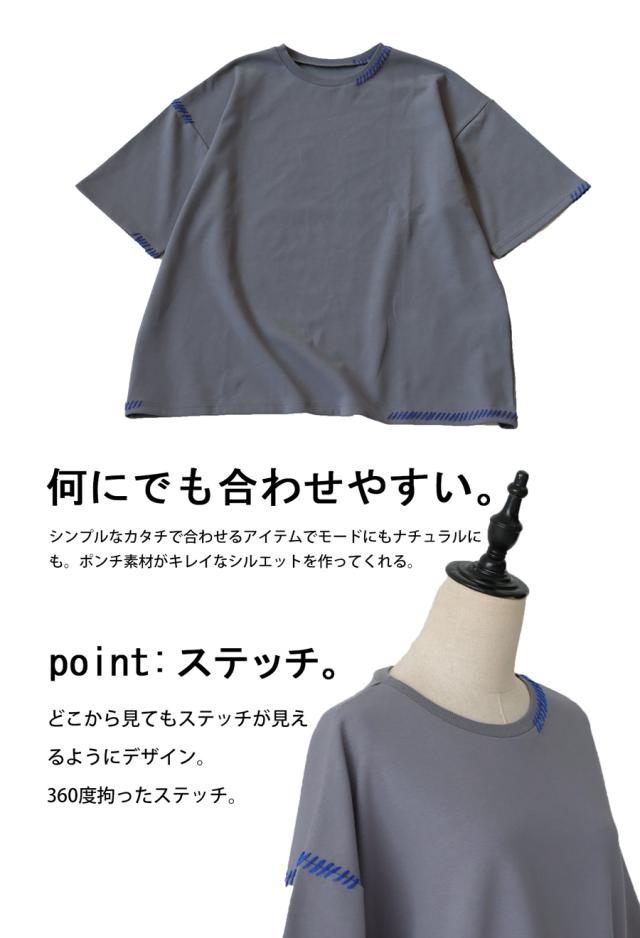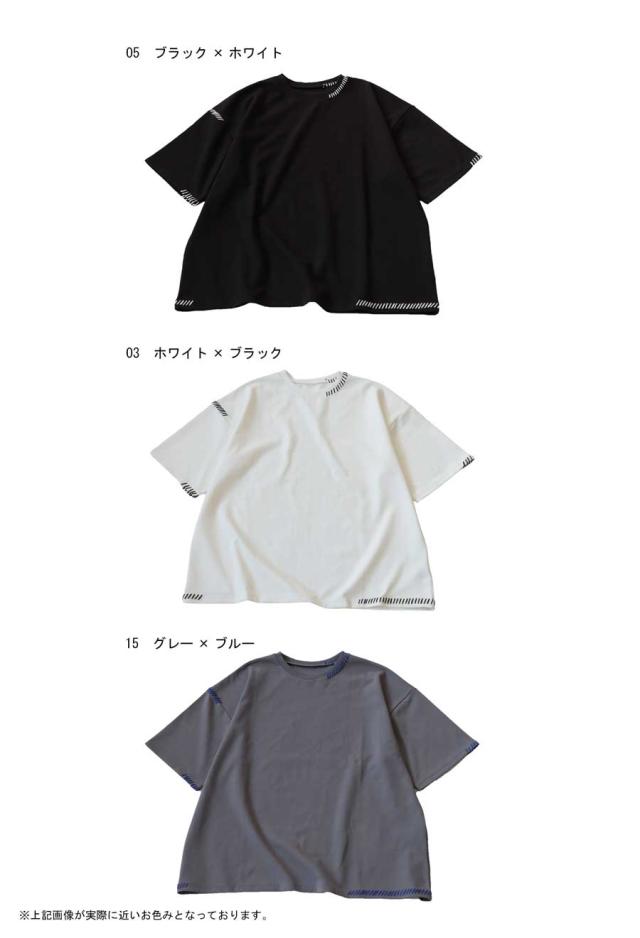 za-00219 トップス 半袖 ポンチ ハンドステッチ ステッチデザイン 配色 丸首ドロップショルダー リブ ゆったり シンプル きれいめ 肌触り なめらか 体型カバー 大きめ ユニセックス