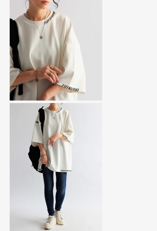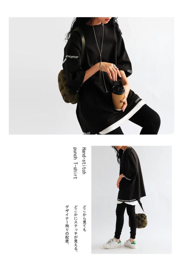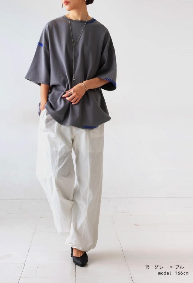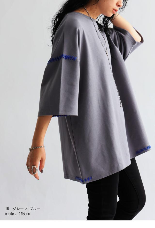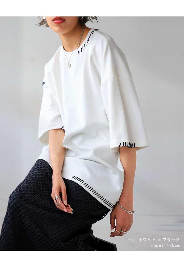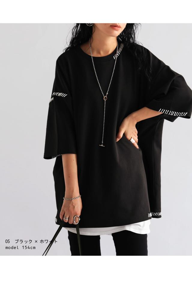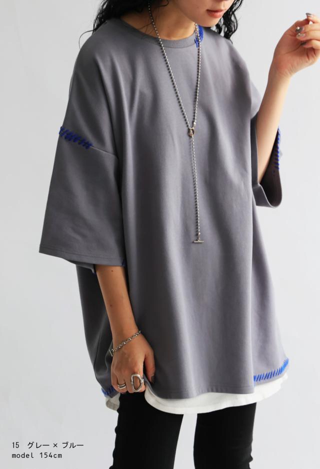 za-00219 トップス 半袖 ポンチ ハンドステッチ ステッチデザイン 配色 丸首ドロップショルダー リブ ゆったり シンプル きれいめ 肌触り なめらか 体型カバー 大きめ ユニセックス