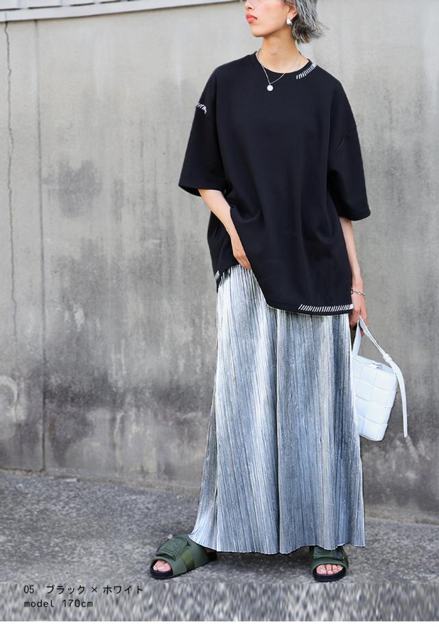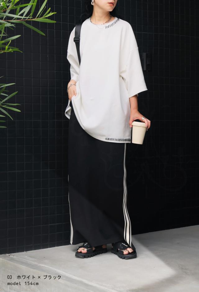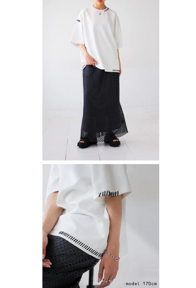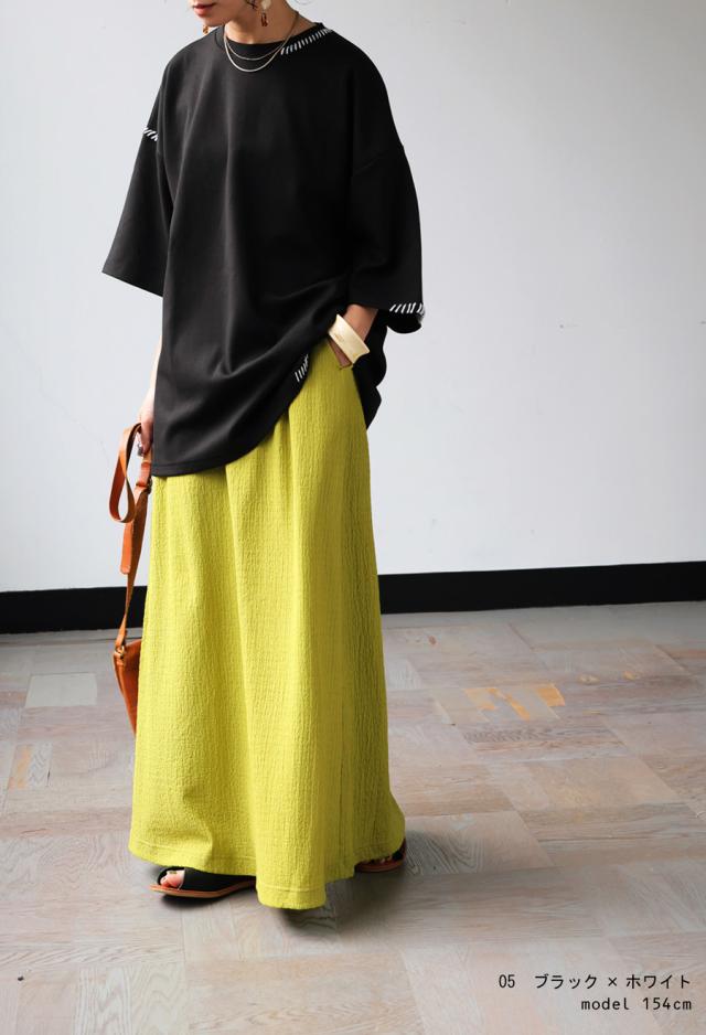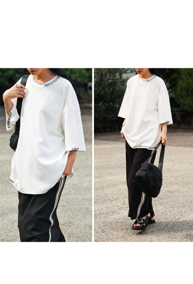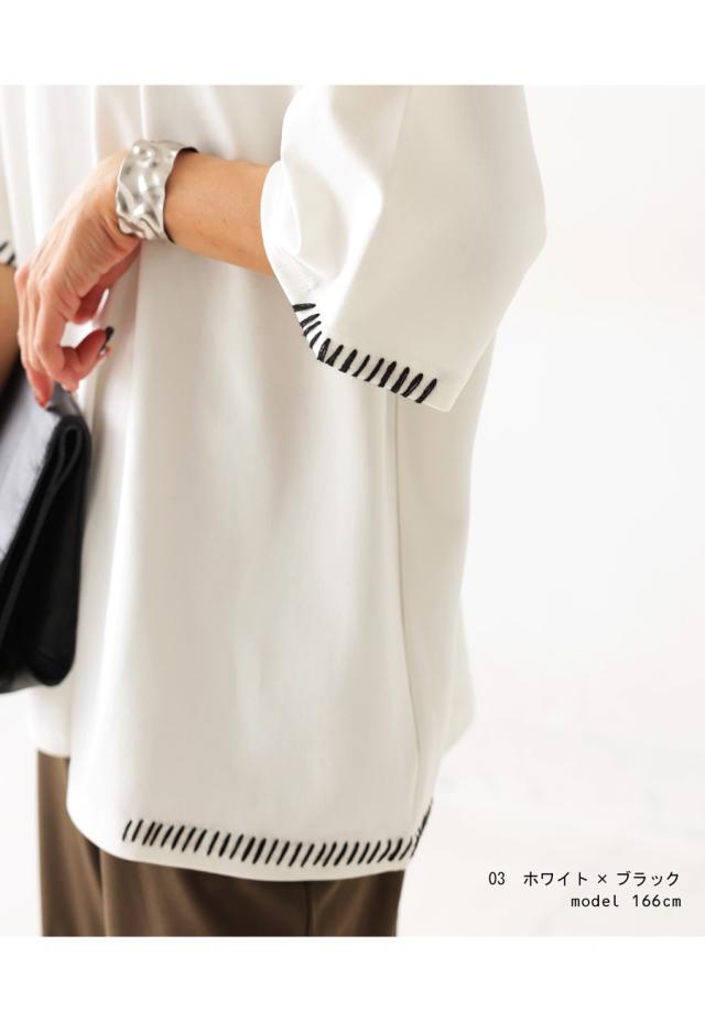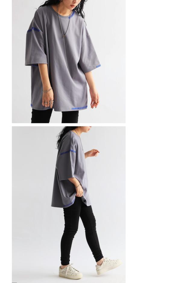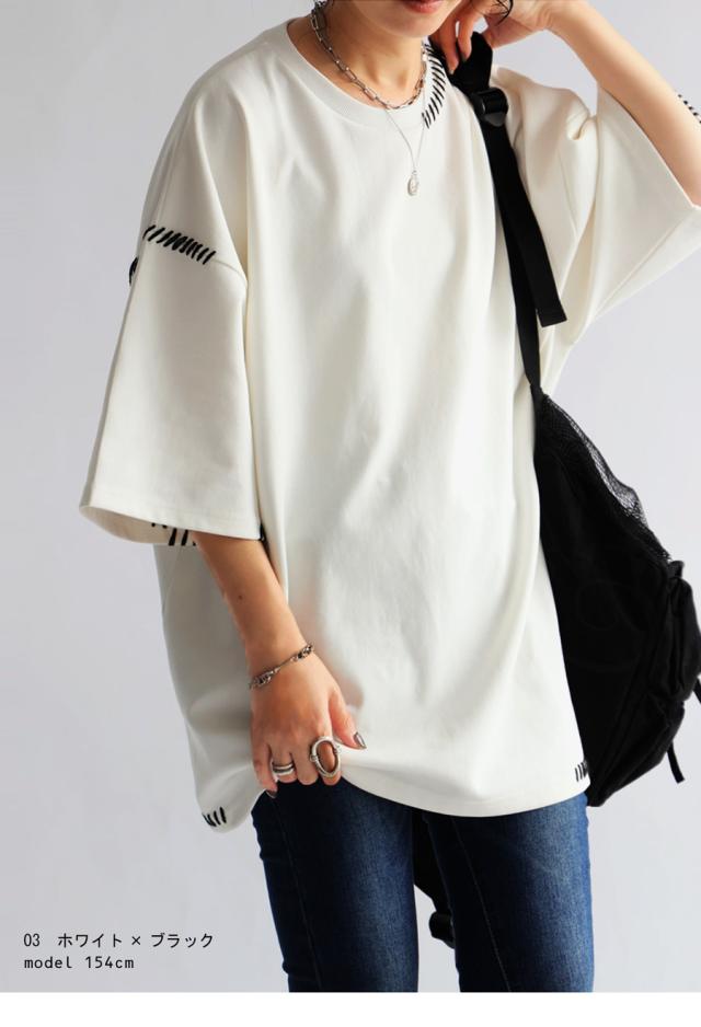 za-00219 トップス 半袖 ポンチ ハンドステッチ ステッチデザイン 配色 丸首ドロップショルダー リブ ゆったり シンプル きれいめ 肌触り なめらか 体型カバー 大きめ ユニセックス