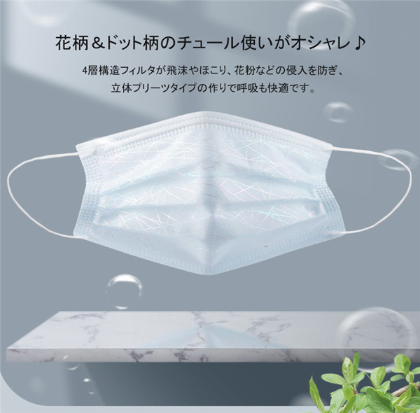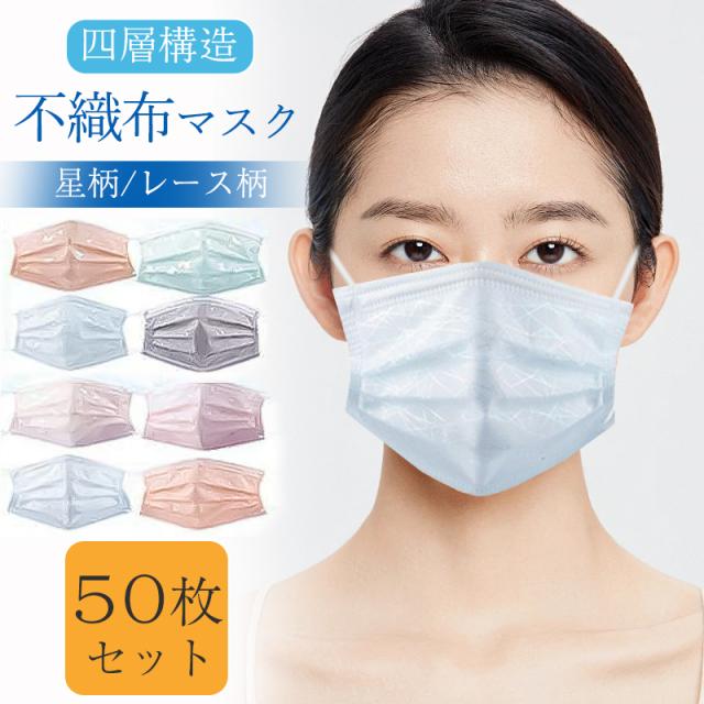 マスク 不織布 チュールマスク 星柄 50枚入り カラー 夏 レース柄 柄入り 可愛い 柄 使い捨て 立体 四層構造 おしゃれ 大人 飛沫対策