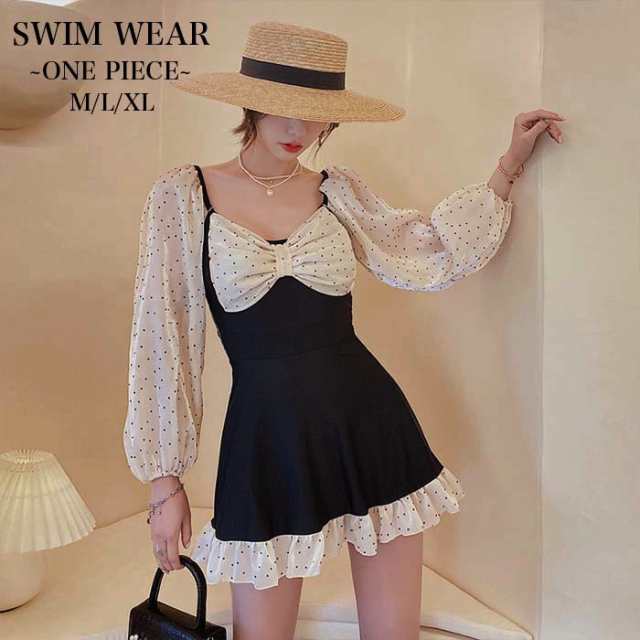 ワンピース 水着 水玉ドット 柄 可愛い レディース 長袖 パフスリーブ スカート ショートパンツ リボン フロントリボン フリフリ フリル お洒落 体型カバー 日焼け防止 対策 ノンワイヤー パッド付き スクエアネック キュート ガーリー 夏 海 プール 映え ギャザー 女性 トレンド 流行り 海外 旅行 マリン スポーツ ハワイアン 海水浴 エレガント リゾート ブラック ホワイト 黒白