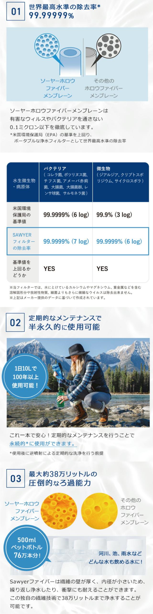 ソーヤーはポータブルな浄水器としては世界最高水準の浄水性能を誇る浄水フィルターです。たくさん水を持ち運ぶ必要がなく、川や湖など、各地に点在する水源から採水してすぐ飲めるため、登山やロングトレイルで親しまれています。超高密度のフィルターでろ過することで、水の中に潜む有害な細菌や水性微生物、エキノコックスなどの寄生虫を99.99999%取り除き、飲料水に変えることができます。