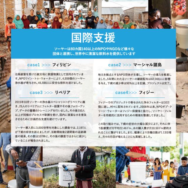 ソーヤーの高い洗浄能力は世界中で評価され、災害被災地や難民キャンプなど、綺麗な水を得ることが難しい世界80カ国以上の国と地域で使用されています。ソーヤーはNPOやNGOと協力し、プロダクトを提供。日々人々に綺麗な水を供給する活動を行っており、提供された地域では下痢や病気の大幅な減少など、多大な功績をあげています。また、売上の中の一部が国際的な支援活動に使われています。