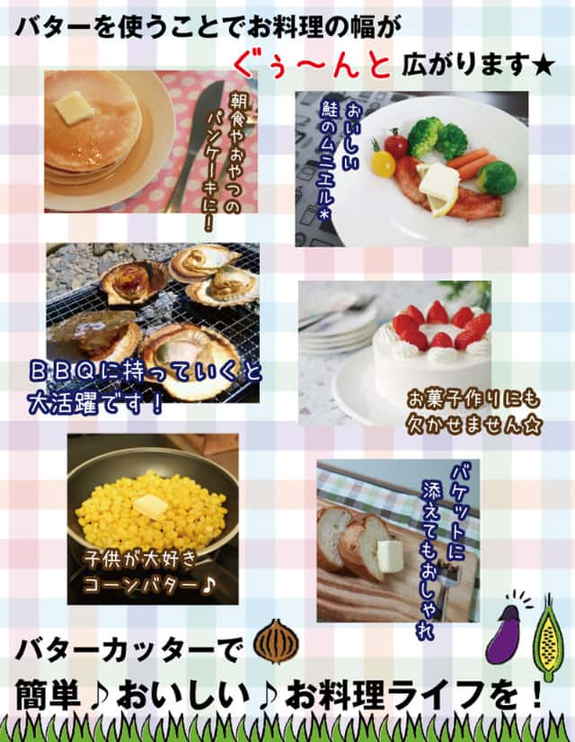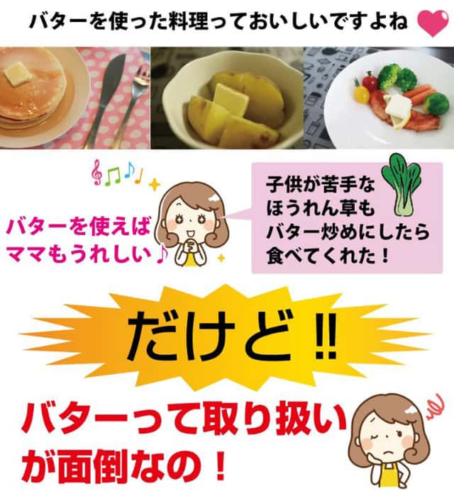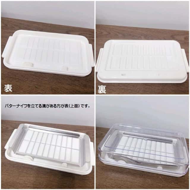 | 主な仕様 | 【商品サイズ(約)】 ○サイズ:107×190×43mm ○重量:210g 【品質表示】 ○フタ:AS樹脂 ○本体:ポリプロピレン ○バターカッター・バターナイフ:ステンレス鋼 【生産国】日本 【商品内容】バターケース、バターカッター、バターナイフ ※市販の200gのバターなどお使いいただけます。 業務用など大きなバターを小さく切って使う場合は 縦6.5×横12.5×高さ3センチ以内にしてお使いください。 ※バターが硬いとカッターが変形する恐れがあるので、 常温に戻したバターをカットして下さい。 |