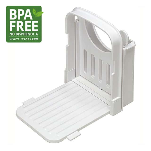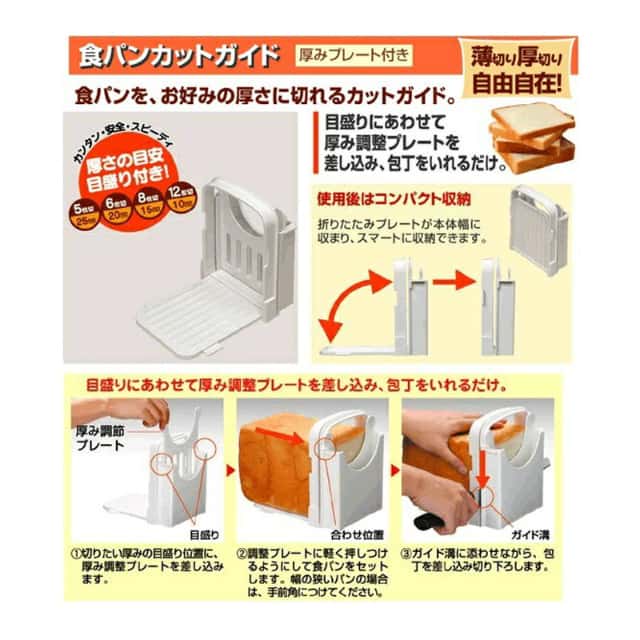 | 主な仕様 | 【商品サイズ(約)】 ○使用時:W190×D145×H177mm ○収納時:W145×D55×H177mm ○重量:260g 【品質表示(耐熱温度)】 ○本体・プレート:ABS樹脂(80度) ○包丁ガイド:ポリエチレン(60度) ●BPAフリー 【対応食パンサイズ】 高さ約15cm、横幅約12cmまで 【厚さの目安目盛り】 5枚切(25mm)、6枚切(20mm)、8枚切(15mm)、12枚切(10mm) 【生産国】日本 ※食洗機はご使用いただけません。 |