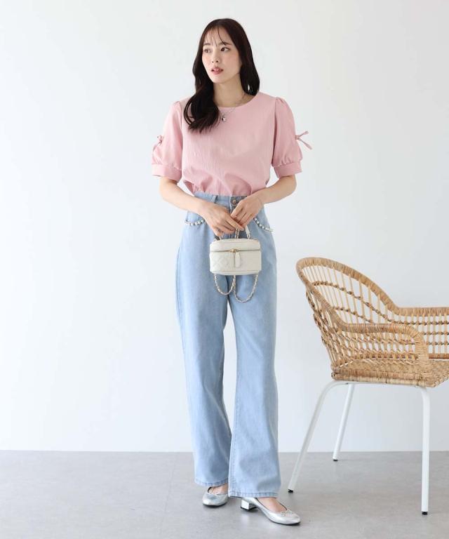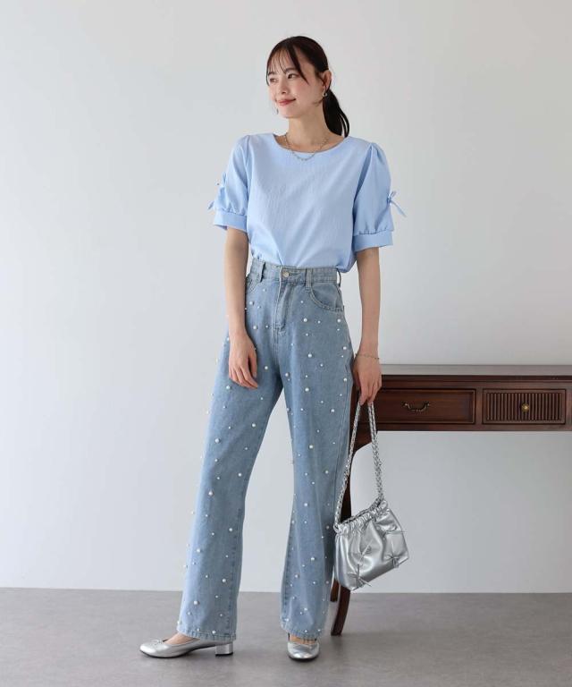 フェミニンな印象のブラウスには、デニムやパンツなどあえてカジュアルなボトムを合わせるのが◎