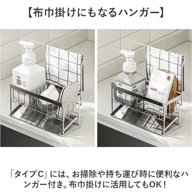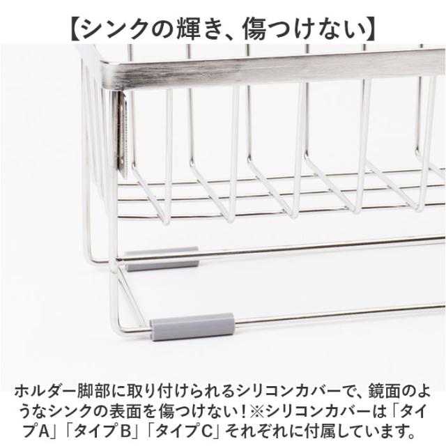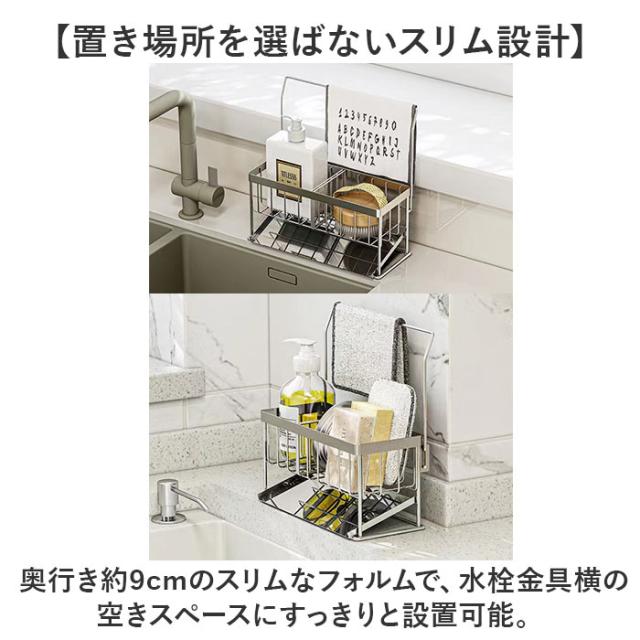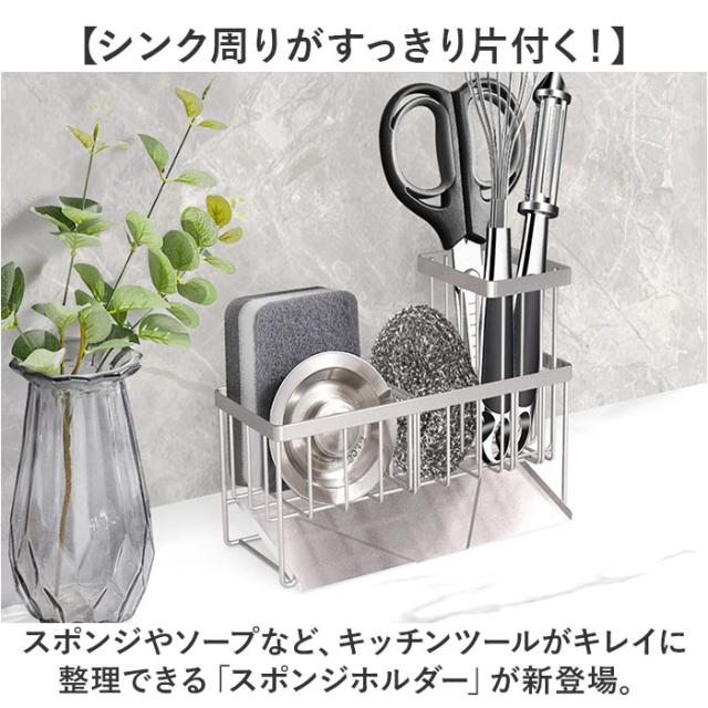 | 商品説明 | 【シンク周りがすっきり片付く!】 ・スポンジやソープなど、キッチンツールがキレイに整理できる「スポンジホルダー」が新登場。 【浮かせるデザインで衛生的】 ・上段ラックにスポンジやハンドソープのボトルをふんわり浮かせて収納。接地面が少なく衛生的。 【水垢汚れやヌメリが気にならない】 ・下段には水滴がシンクに直接流れる「傾斜トレー」付き!水受け皿タイプよりお手入れ簡単! 【便利な可動仕切り付き】 ・スポンジやボトルの大きさに合わせて自由にスペース調整ができる可動タイプの仕切りが付属。 【高品質ステンレスフレーム】 ・錆に強く耐久性に優れたステンレス製フレームを採用。丈夫で長く使えて、洗浄作業も楽ちん。 【シンクの輝き、傷つけない】 ・ホルダー脚部に取り付けられるシリコンカバーで、鏡面のようなシンクの表面を傷つけない! ・※シリコンカバーは「タイプA」「タイプB」「タイプC」それぞれに付属しています。 【カトラリーボックスで整理上手に】 ・「タイプB」には、フライ返しなど長さのある調理器具の整理に役立つカトラリーボックス付き。 【布巾掛けにもなるハンガー】 ・「タイプC」には、お掃除や持ち運び時に便利なハンガー付き。布巾掛けに活用してもOK! 【置き場所を選ばないスリム設計】 ・奥行き約9cmのスリムなフォルムで、水栓金具横の空きスペースにすっきりと設置可能。 【シンプルで清潔感のあるキッチンに】 ・どんなキッチンにも素敵に馴染むシンプルなデザインで、毎日の家事の手間がグッと効率的に。 |
