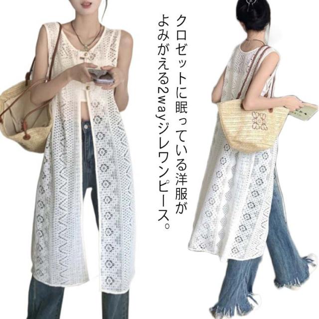 ワンピース ロングジレ 2WAY 総レース 羽織り レイヤード ノースリーブ ロングワンピース 柄ワンピースに重ね着 ベスト ロング丈 レディース 花レース レイヤード ベストワンピース キャミワンピース
