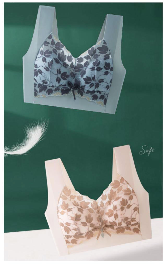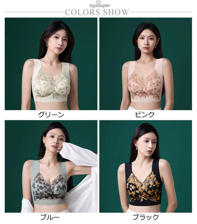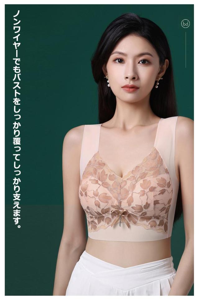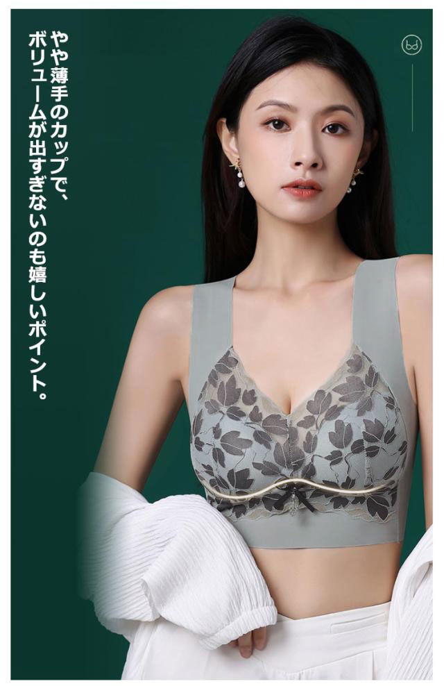 | 締め付け感ゼロ!大きな胸を小さく見せるブラ。 やや薄手のカップで、ボリュームが出すぎないのも嬉しいポイント。 ノンワイヤーでもバストをしっかり覆ってしっかり支えます。 花柄レースがしっかり胸をつつんで綺麗なシルエットを作ります。 脇高&幅広設計で背中から脇にかけてのハミ肉をしっかり支え、サイドのラインをすっきりととのえる。 肩にくい込みにくい幅広ストラップは、肌側がポコポコしているからズレにくく快適です。 特有のU字型バックストラップで背中をフラットに抑え、スッキリとした後ろ姿に。 | |