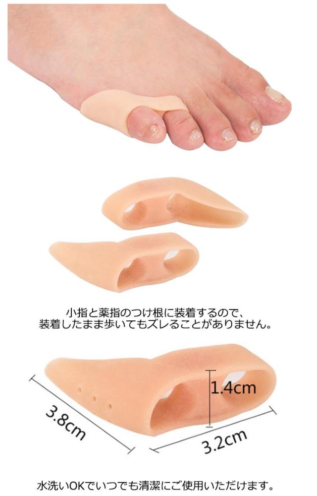| 5足入り/靴に擦れる小指のつけ根をしっかり保護! 内反小趾で、出っ張った小指のつけ根が靴に擦れてつらい人にぴったりの内反小趾サポーターです。 リングタイプなので、かんたんに着脱ができ、靴を履いても違和感がありません。 左右の違いもございませんので、どちらの足にも装着して頂けます。 柔らかなエラストマージェルで出来ているので 足指に優しい付け心地です。 小指と薬指のつけ根に装着するので、装着したまま歩いてもズレることがありません。 水洗いOKでいつでも清潔にご使用いただけます。 | |