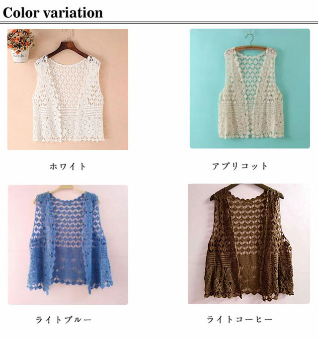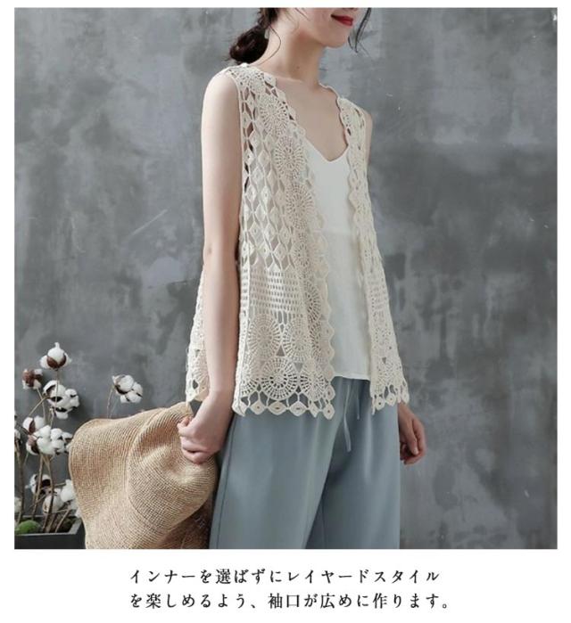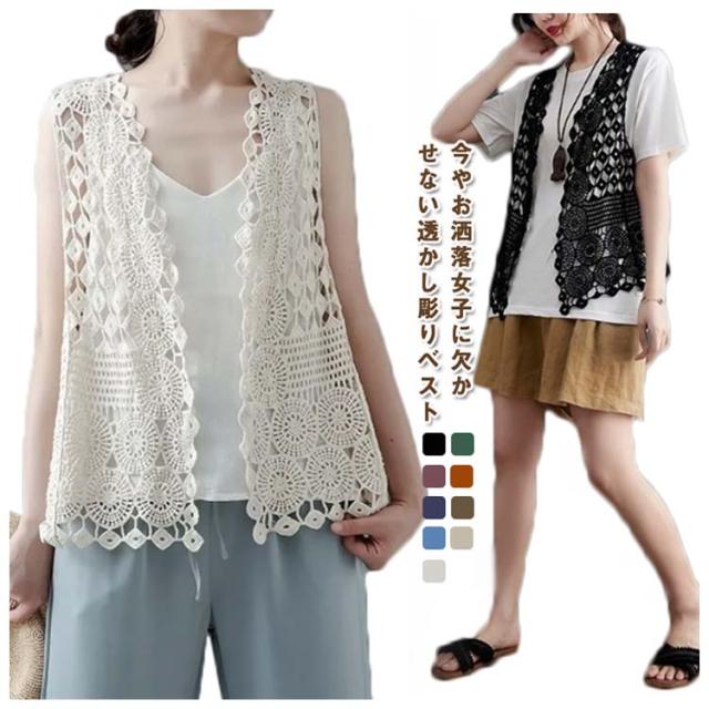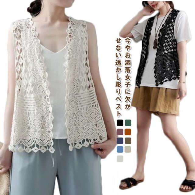 ベスト レディース サマー ベスト ジレ ニットベスト 前開き ニット トップス レイヤード 透かし編み 透かし彫り フェミニン Vネック かぎ編み 総柄 ノースリーブ 春 夏 おしゃれ ジレベスト ショート丈 着回し 重ね着 薄手 カジュアル 体型カバー 通勤 可愛い 送料無料