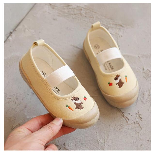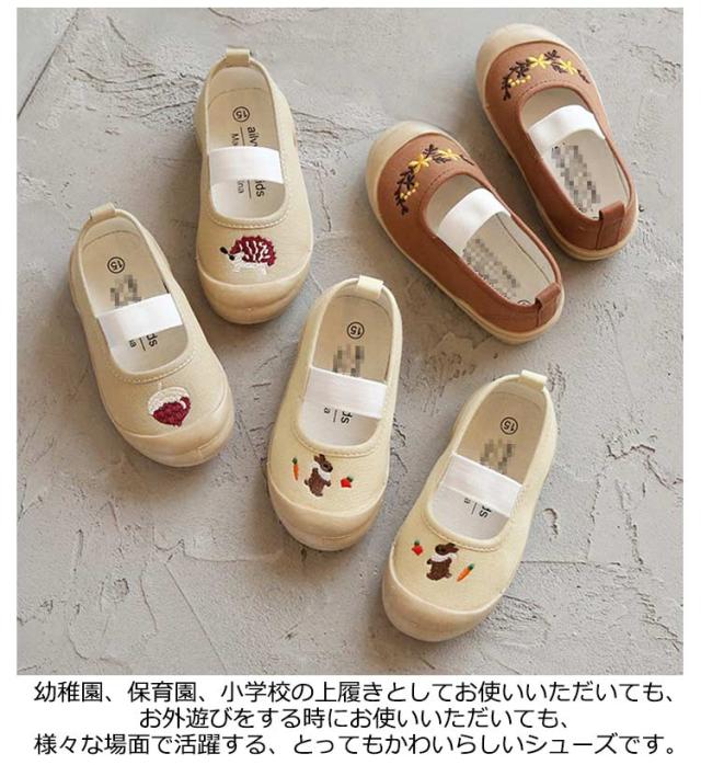 | アッパーに刺繍をあしらった、かわいらしい上履き。 キャンバス生地を使用しているため、お手入れは丸洗いでOKですよ。 子どもも脱ぎ履きがしやすい1本ゴムタイプです。 幼稚園、保育園、小学校の上履きとしてお使いいただいても、お外遊びをする時にお使いいただいても、様々な場面で活躍する、とってもかわいらしいシューズです。 | |