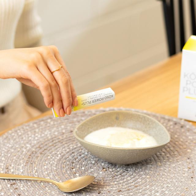 粉末をそのままお召上がりいただくか、口に入れてから少量のお水と一緒にお召し上がりください。ヨーグルトに混ぜたり、スムージーやプロテインに入れても◎
