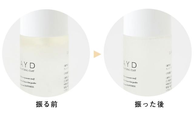 使用前によく振ることによって、二層に分かれていた水と油がしっかりと混ざります。 ※クレイウォーターオイルの残量が少なくなってきました際、乳化状態がより長くなり、色もより乳白色になりますが、品質に問題はございません。