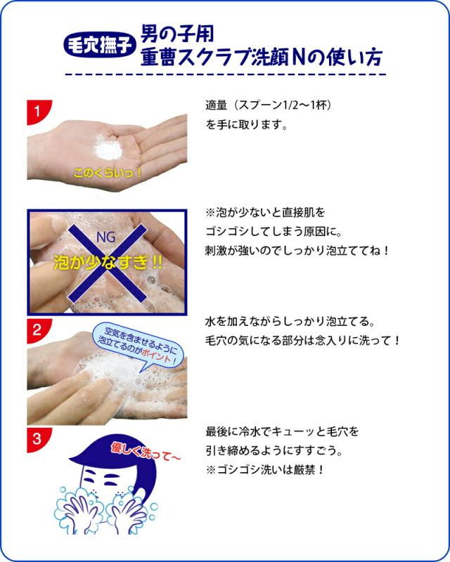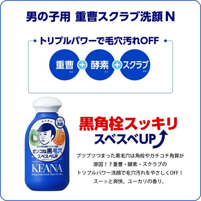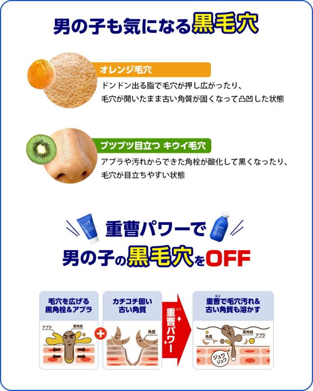 | 黒毛穴の汚れをかきだしてスッキリ!男の子用重曹スクラブ洗顔料。 男の子の毛穴問題はぎっしり詰まった黒角栓と広がったままの頬の凹凸。ただ洗うだけでは落ちにくい汚れも、重曹*2+酵素*1とスクラブ*4のトリプルパワーでやさしくOFF。重曹*2がジュワジュワ皮脂を溶かし、ブルースクラブ*4で頑固な黒角栓を引っ張り出します。 さらに、酵素*1で角質を分解。重曹*2スクラブ*4がカチカチ角質に潤いを与えながら「Wスクラブ*4」でゴロゴロ絡めとります!さらに、すーっと爽やかなユーカリの香りで、気分もリフレッシュ!気になるキウイ肌やオレンジ肌の汚れにやさしく働きかけ、すべすべな肌へと導く洗顔料です。 | ||||||||||||||||