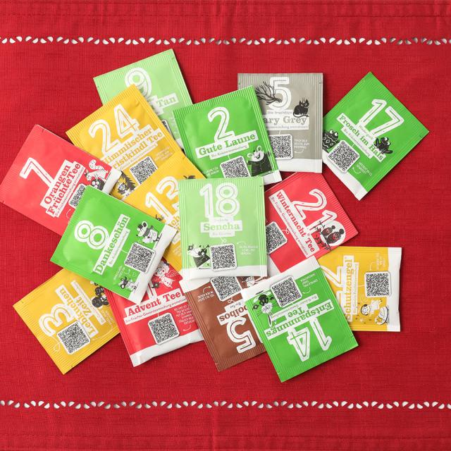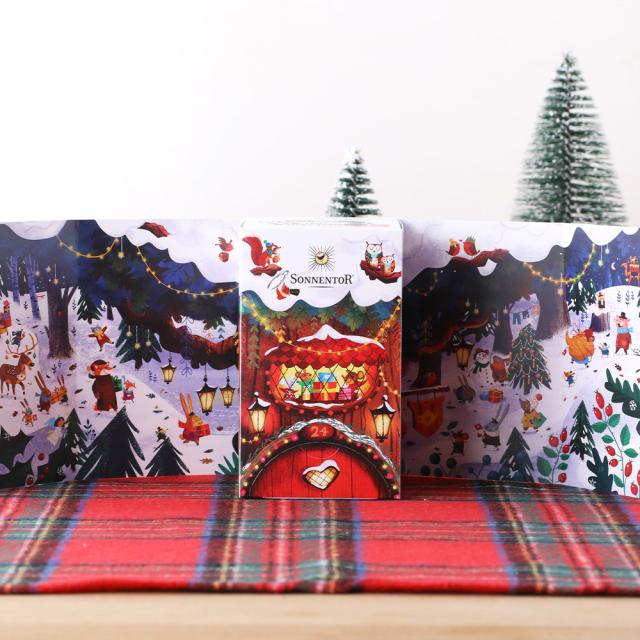 動物たちのクリスマスパーティーをのぞき見! 今年もゾネントアからクリスマスまでの期間を楽しむカウントダウンのお茶が登場!イエス・キリストの降誕を待ち望むアドベントの期間に、一日一種類ずつのお茶をお楽しみいただけるアソートセットです。ティーバッグの包装一つ一つに、1〜24までの番号がふってあります。24種類のお茶を味わいながら、クリスマスまでのカウントダウンを、ご家族や大事な人たちと楽しんでみませんか?