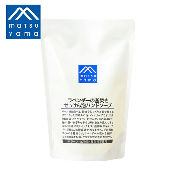 | ラベンダーの香りが手を包み込む。 こだわりの焚き製法で優しく洗い上げるハンドソープ。 松山油脂 ラベンダーの釜焚きせっけん泡ハンドソープ (詰替用) 340ml 昔ながらの釜焚き製法でつくった石けんの泡ハンドソープ。泡切れが早く、すすいだ後は洗浄成分が肌に残りません。さらに天然保湿成分のグリセリンを配合。洗った後の手を優しく保湿します。 泡に包まれている時や洗い終わった後ほのかにフローラルで柔らかい香りが感じられます。天然のラベンダー精油を使用しているため保湿と香りが優しく手を包み込んでくれます。 | |