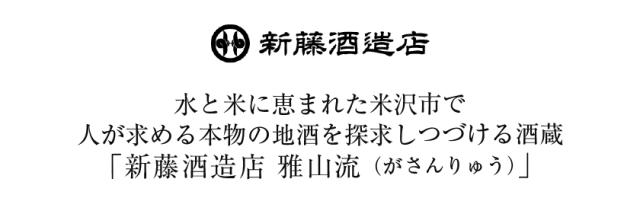 ![]() | 変化していく食文化と共に、 酒文化もまた進化していくことが自然の流れ 新藤酒造を代表する『雅山流』は、10代目の「自由な発想で様々な酒を醸したい」という思いから誕生しました。 “山は動かぬもの 川は流れるもの”と、人は自然の中の万物を固定して捉えがちですが、その観念に捉われず、もっと新しく自由な発想を持ちたい。酒造りにおいても固執した考えを払い、自然体でその技を磨き醸しあげる、変化していく食文化と共に、酒文化もまた進化をしていくことが自然な流れである、という考え方です。 自らの田んぼで自らが育てる「出羽燦々」を贅沢に使い醸す『雅山流』は、米沢の自然を最大限に活かしつつ、過去の価値観や世間体に捉われることなく自由な発想で醸され、“本物の地酒”としての輝きを放ちます。 |