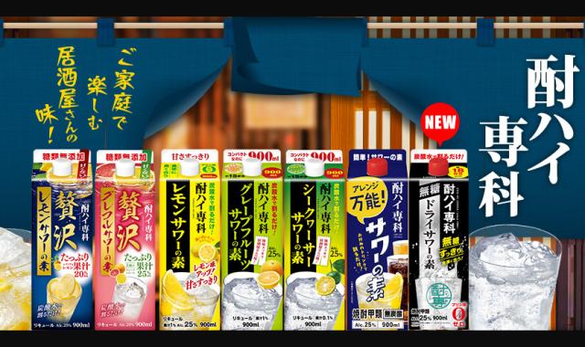 さまざまなチューハイを楽しむことができる甲類焼酎「酎ハイ専科」を始め、本格的なレモンサワーをお手軽に作れる「酎ハイ専科レモンサワーの素」など、お手軽にプロの味わいを楽しめます。