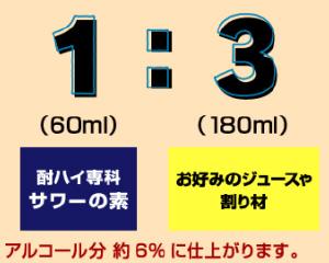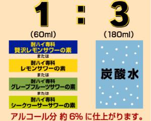 ![]() | 酎ハイ専科シリーズは、炭酸水で割るだけで居酒屋さんで飲む、レモンサワーやグレープフルーツサワー、シークヮーサーサワーを、家でも簡単に楽しめます。 酎ハイ専科1:炭酸水3で割ると、アルコール分は約6%と飲みやすい仕上がりです。 氷はたっぷり、炭酸水はよく冷やして。炭酸水は、ガスが抜けないよう氷にあてずにゆっくりそそぐと強炭酸に仕上がります。 |