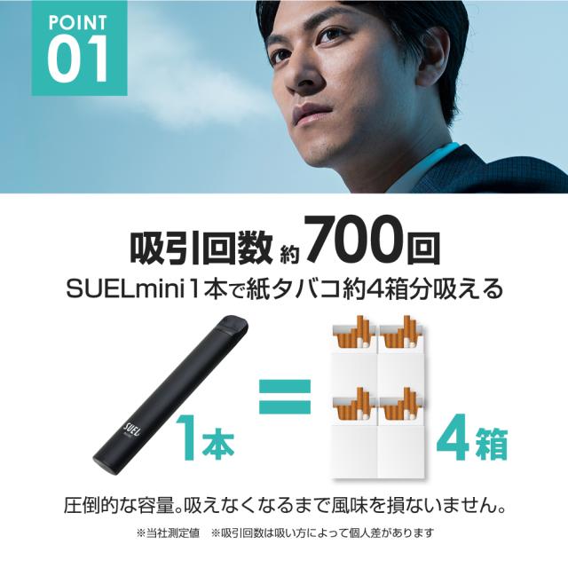 本商品のSUEL mini(スエル ミニ)は約700回の吸引が可能。紙たばこに換算すると、なんと!約4箱分の吸引量となります。