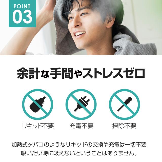 加熱式タバコのようなリキッドの交換や充電は一切不要。吸いたいときに直ぐ喫煙可能です。